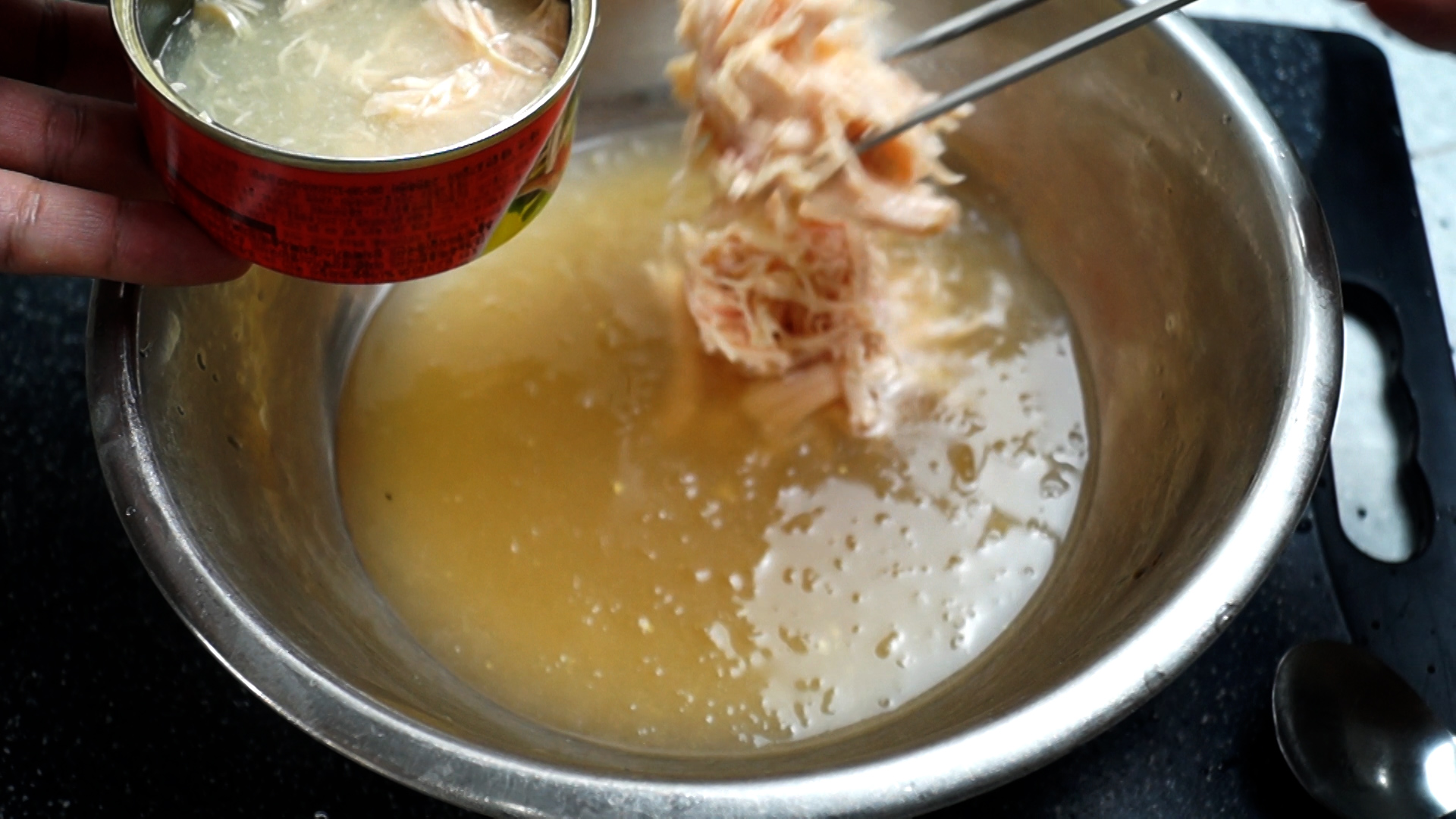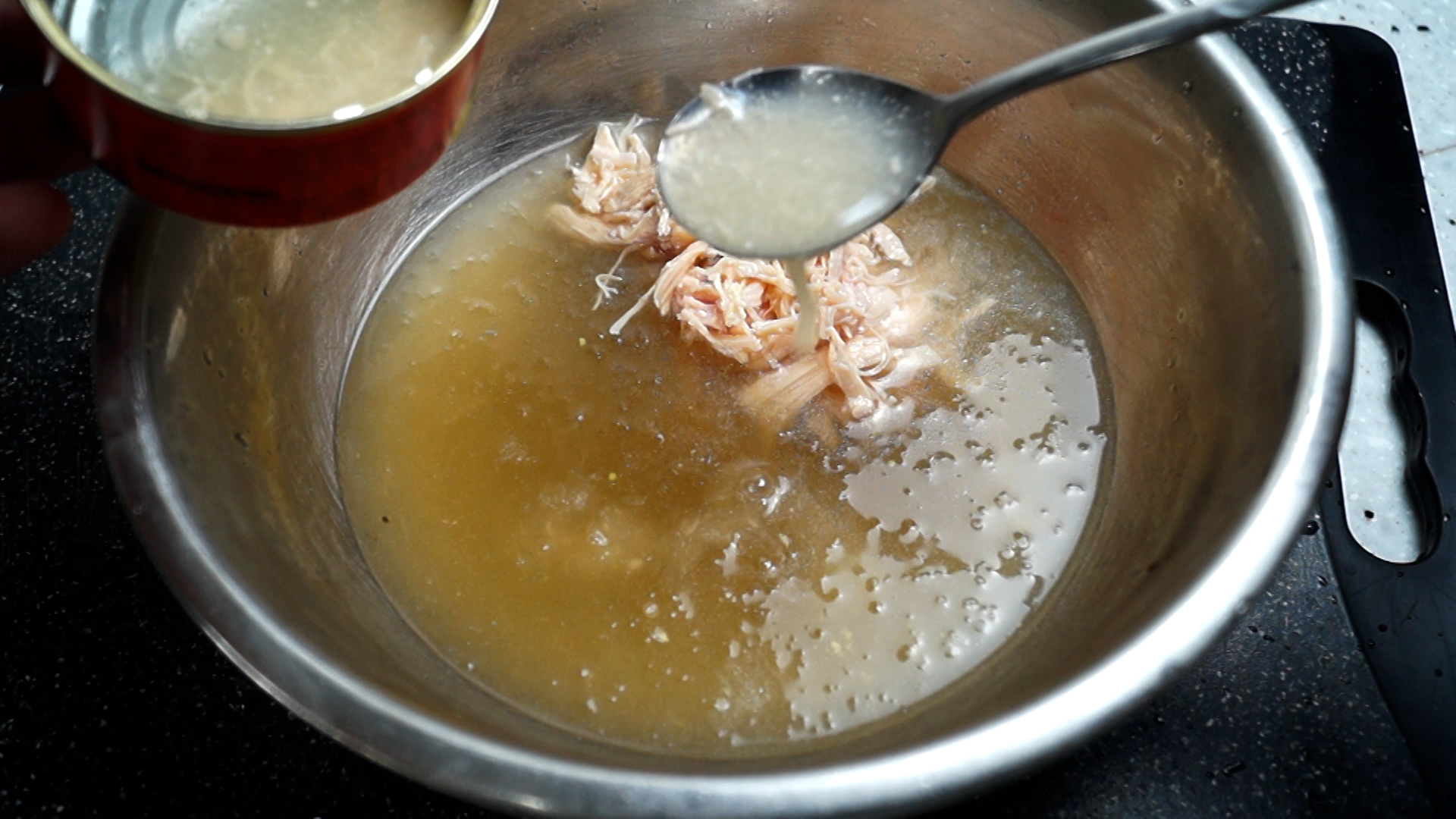15. 캔속 국물을 육수에 3스푼 넣어주세요. 이렇게 하면 육수에 닭육수 맛이 은은하게 베어나옵니다.