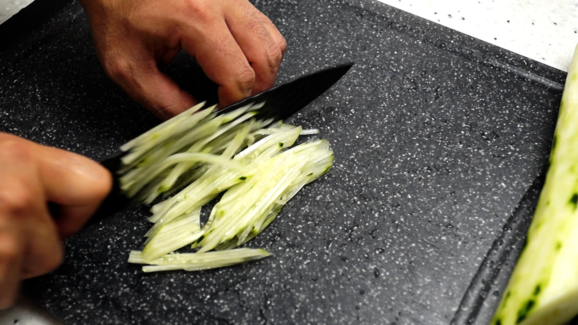 10. 육수를 차갑게 하는동안 오이를 기호에 맞게 채를 썰어 준비해주세요.