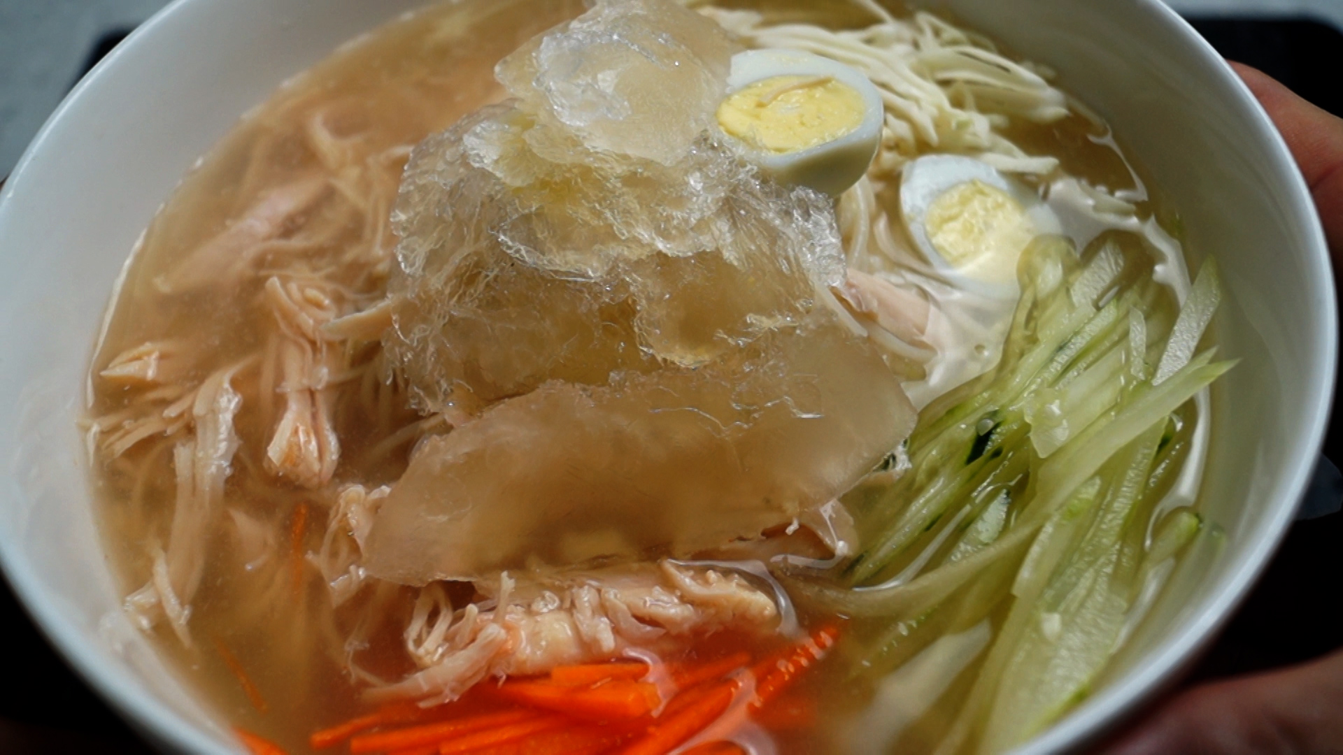 22. 차갑게 만든 건더기를 전부 얹어주고 살얼음 낀 육수를 전부 부어주세요.