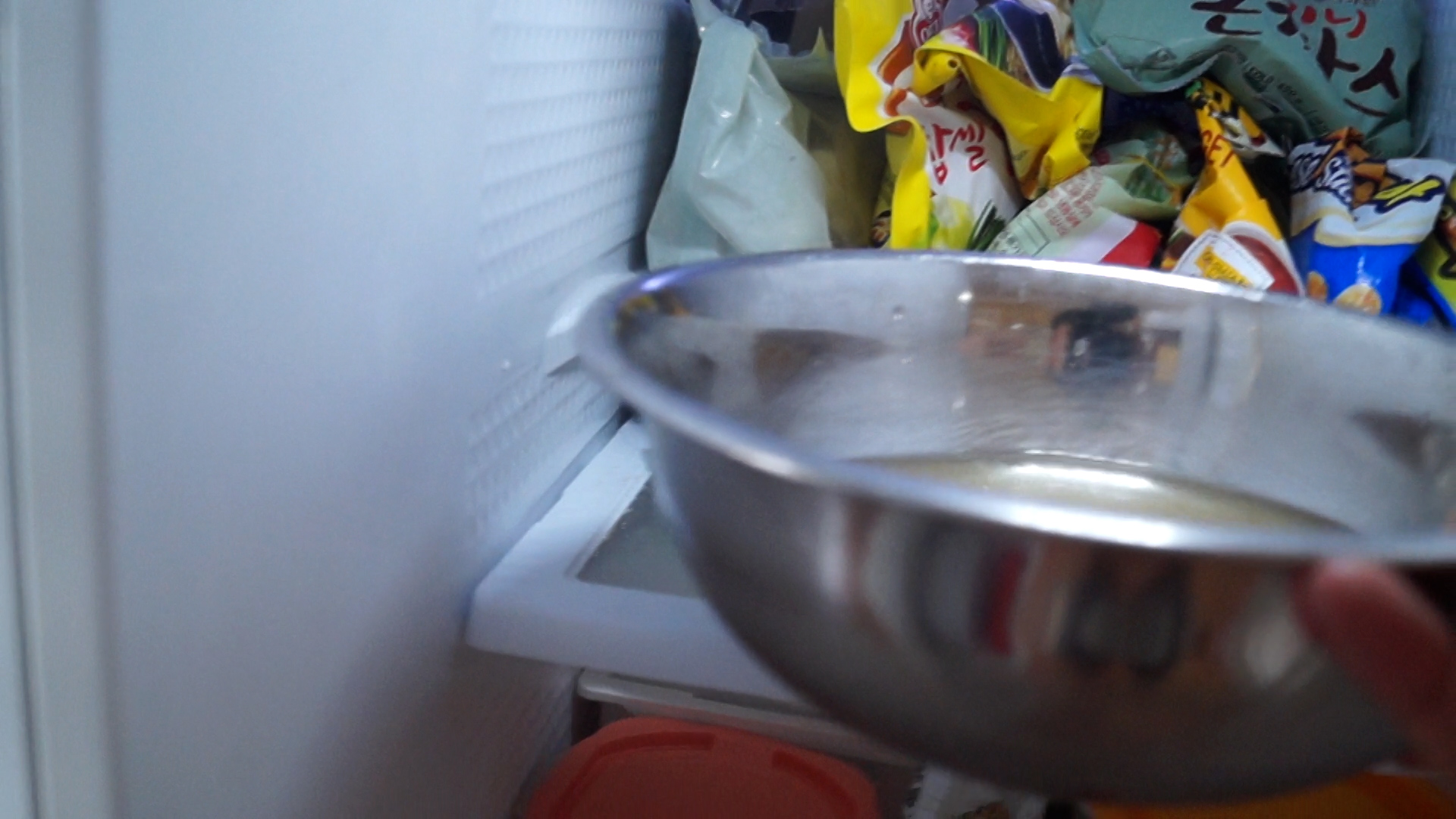 9. 육수를 냉동실에 3시간 가량 넣어주세요. 1시간에 한번 저어주면 살얼음이 좀더 균일하게 만들어집니다.