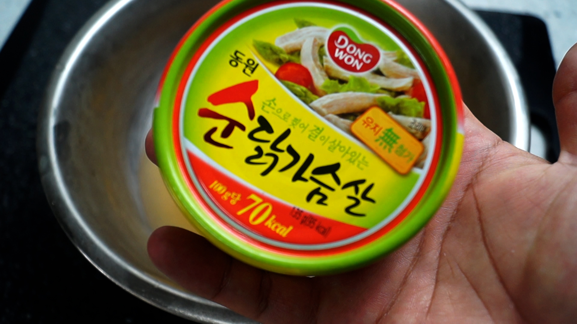 13. 시판 닭가슴살 1캔을 준비해주세요. 요게 오늘 육수와 국수 맛의 핵심입니다!