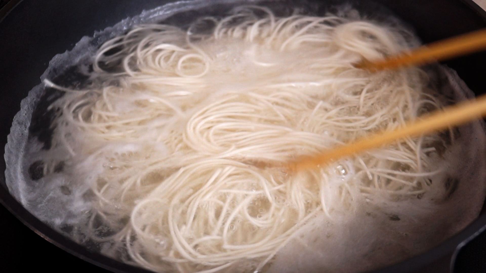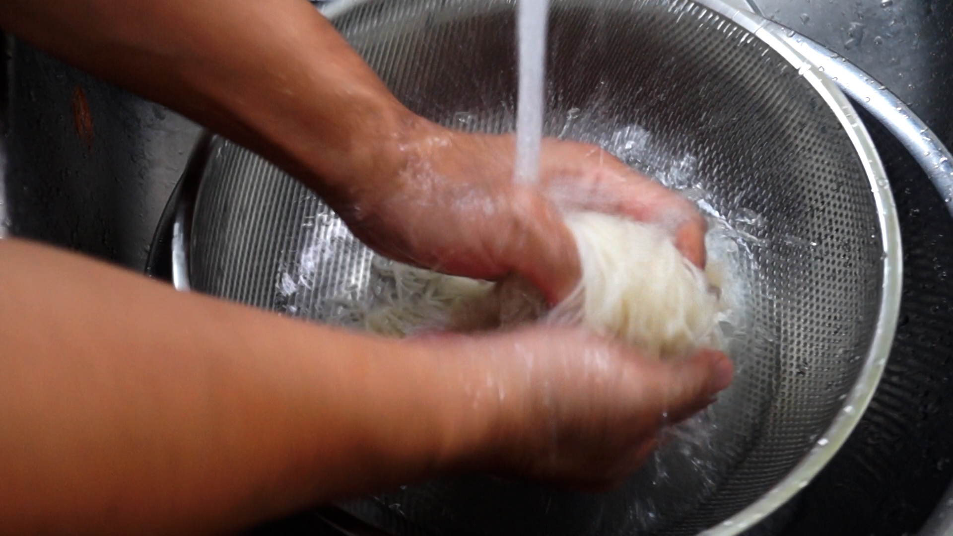 18. 찬물을 넉넉하게 받아서 2~3차례 면을 박박 씻어서 전분기를 빼주고 면을 차갑게 해주세요.