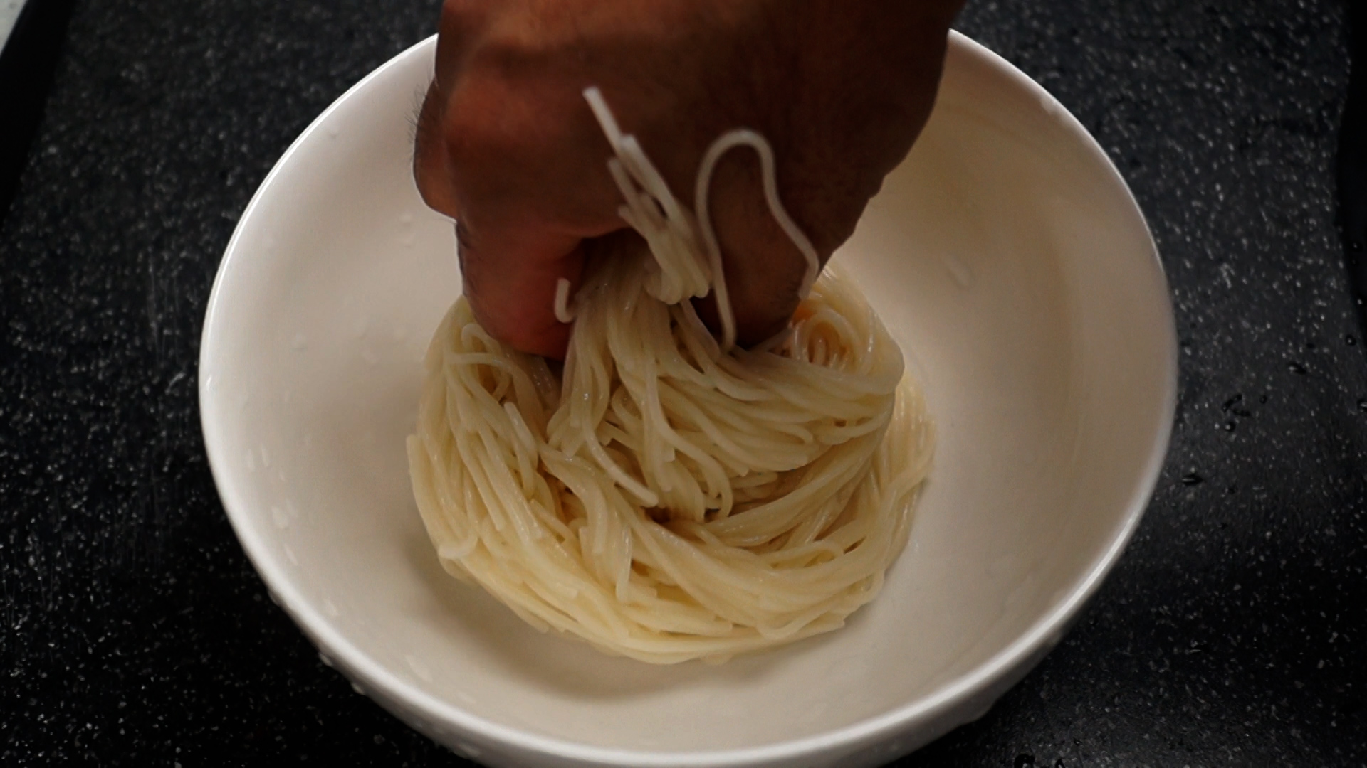 19. 물기를 꽉 짜낸 국수를 그릇에 담아주세요.