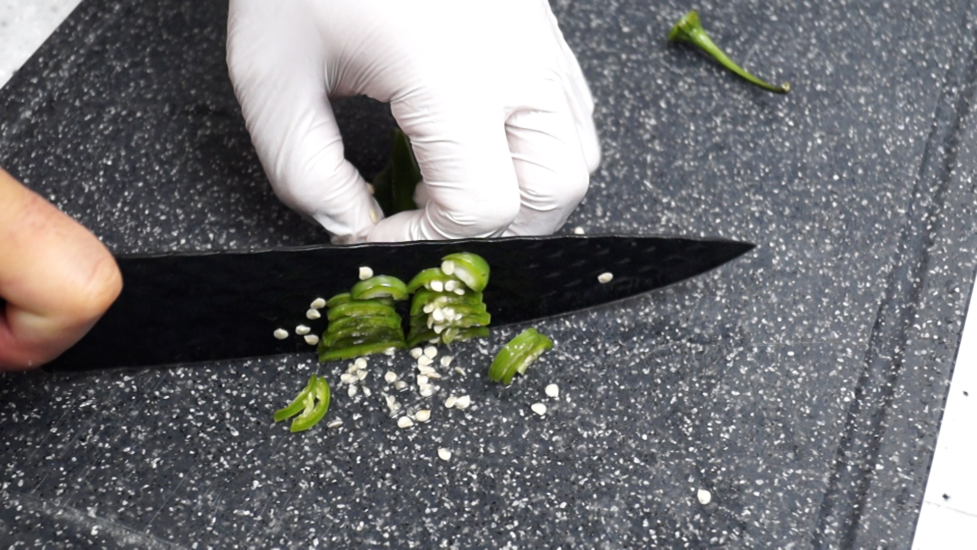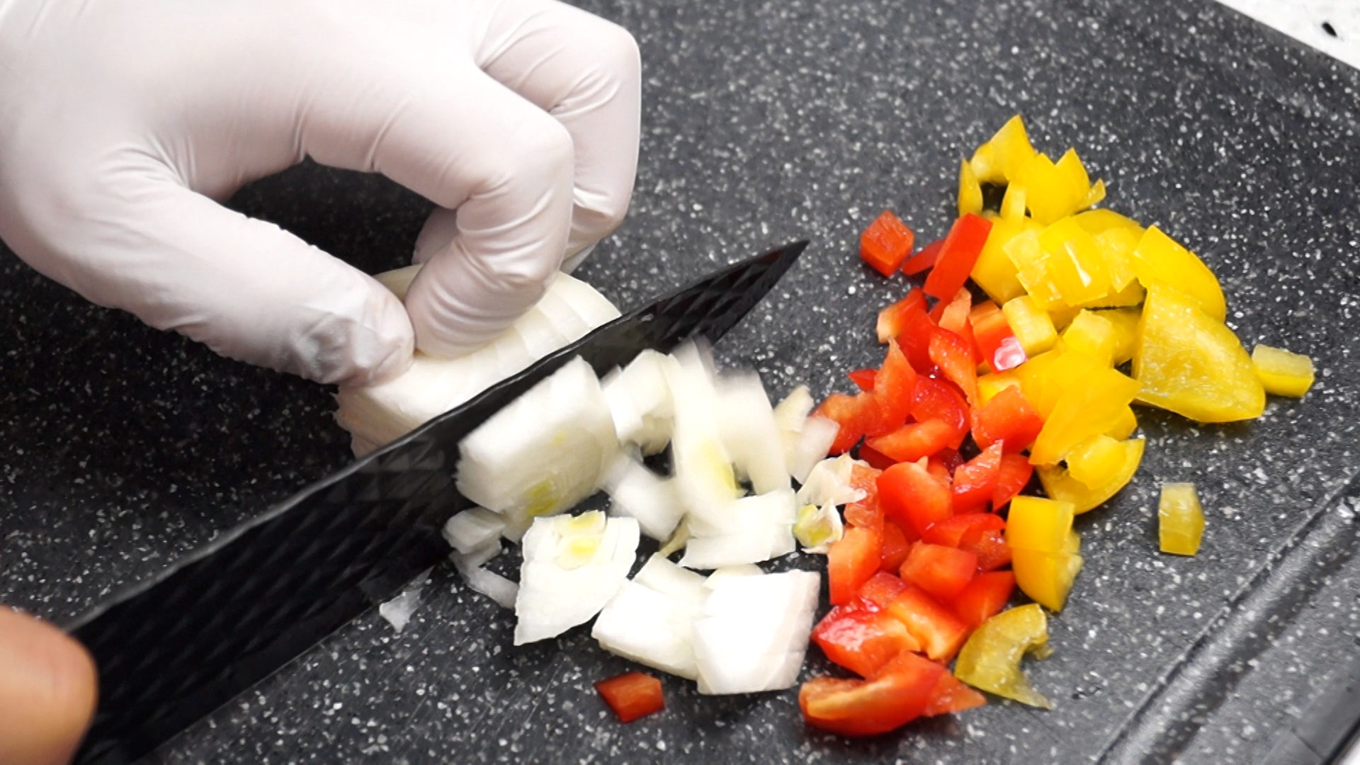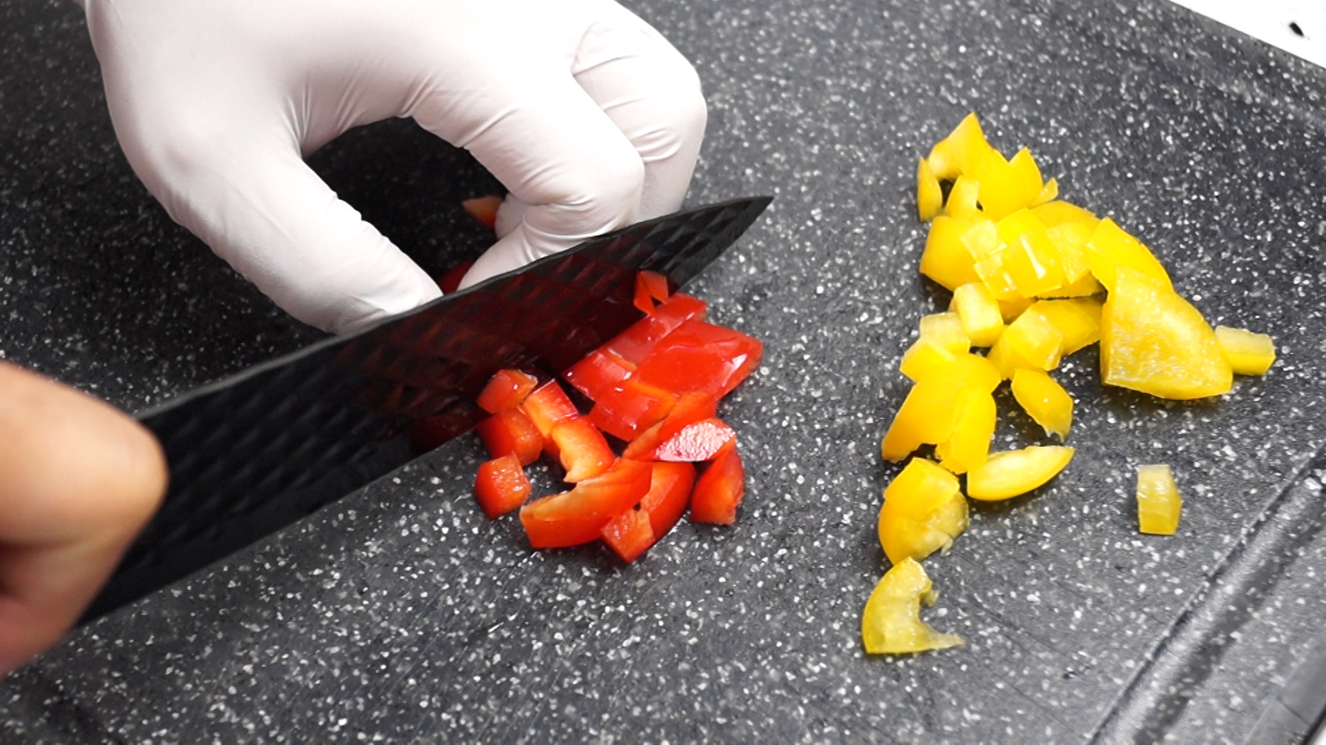 5. 파프리카 1/4개 50g 을 1cm 크기로 깍둑 썰어주세요.