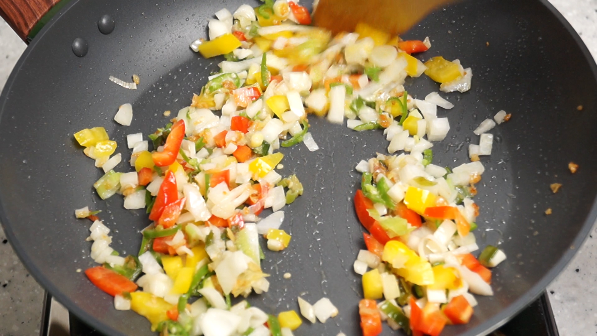 20. 야채를 넣고 불을 강불로 올리고 1분간 강하게 볶아주세요.