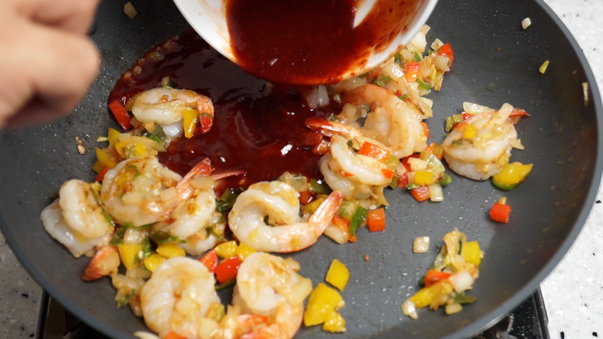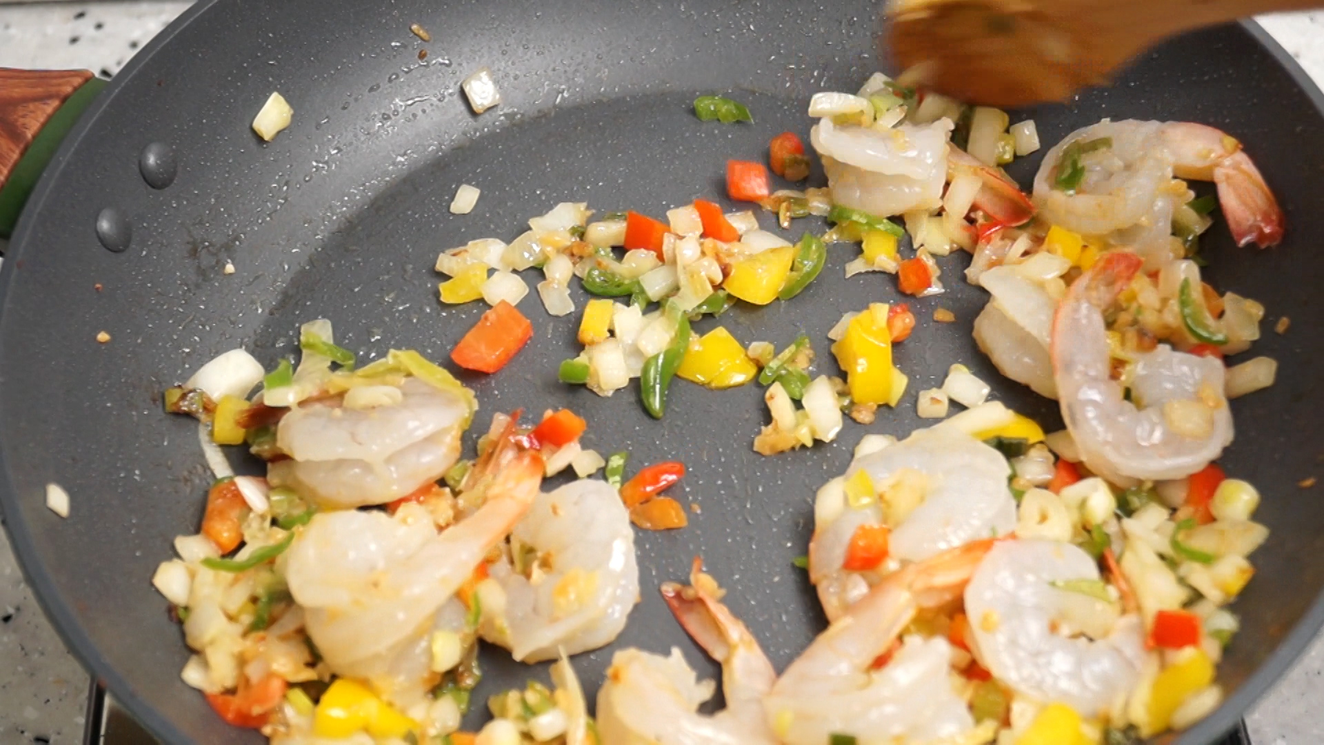 21. 새우를 넣고 강불에 1~2분간 볶아주세요.