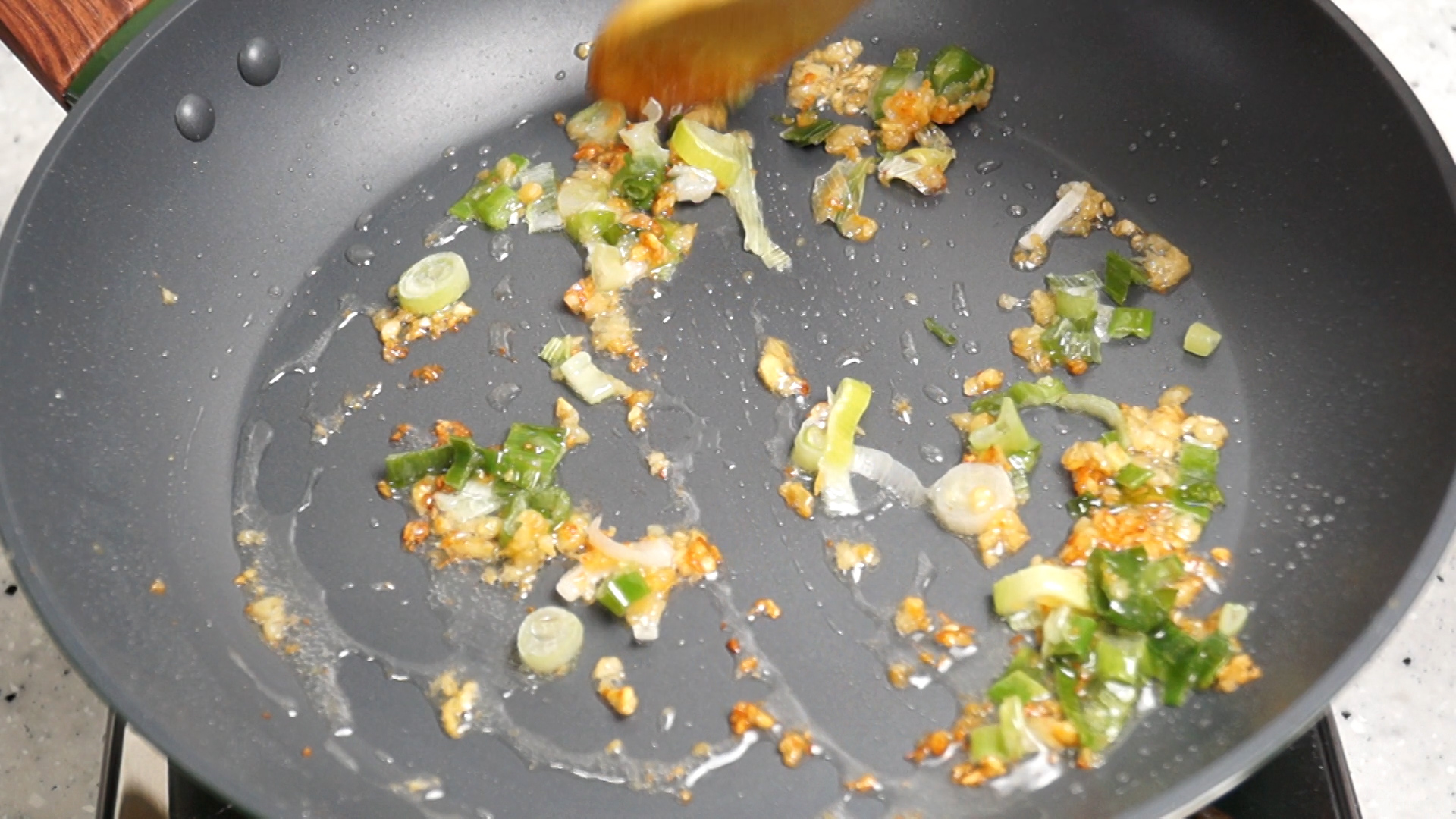 19. 대파를 넣고 1분간 약불에 볶아주세요.
