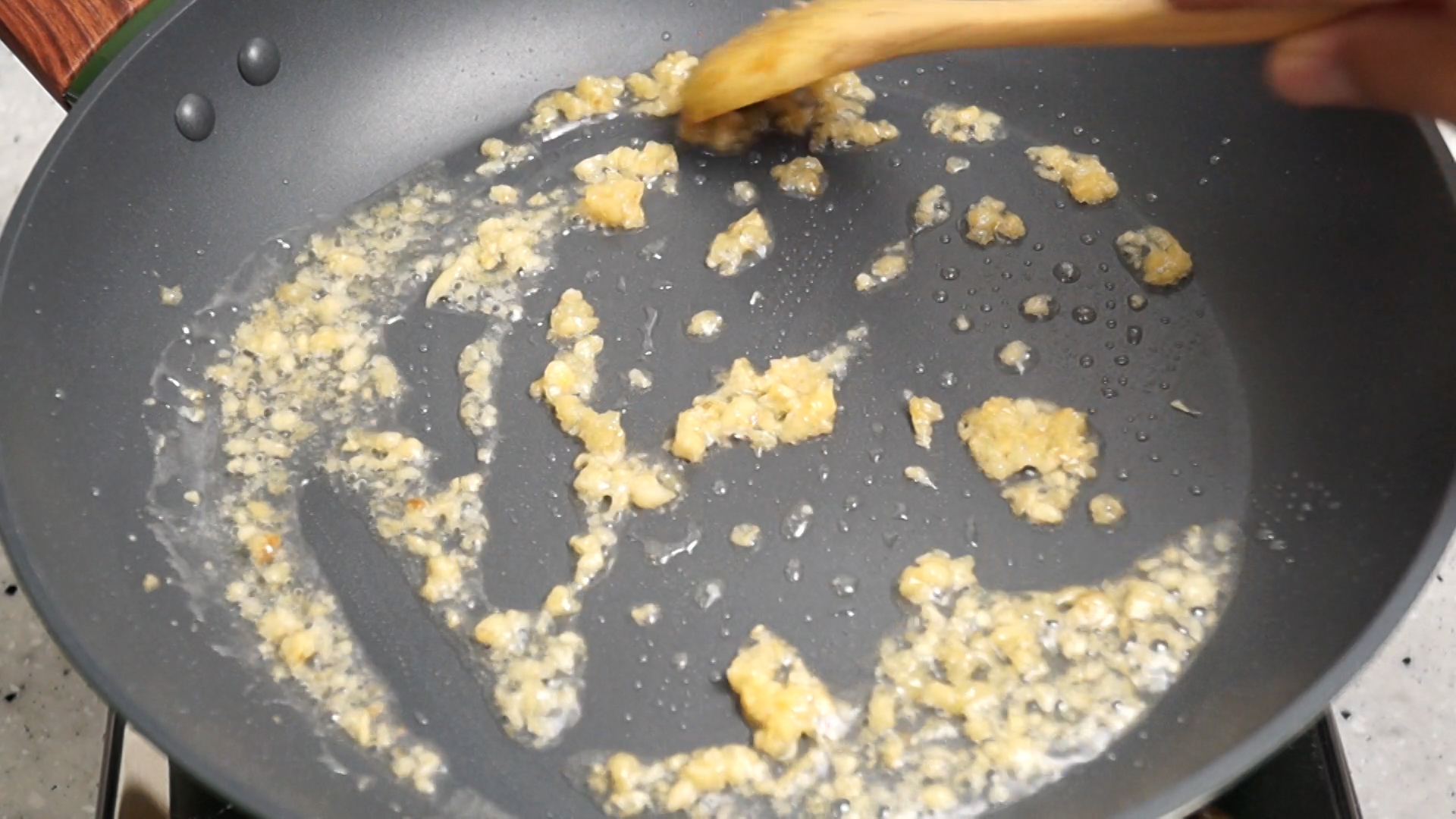 18. 팬에 식용유과 마늘을 넣고 약불에 자글 거리면 2분 정도 약불에 튀겨주세요.