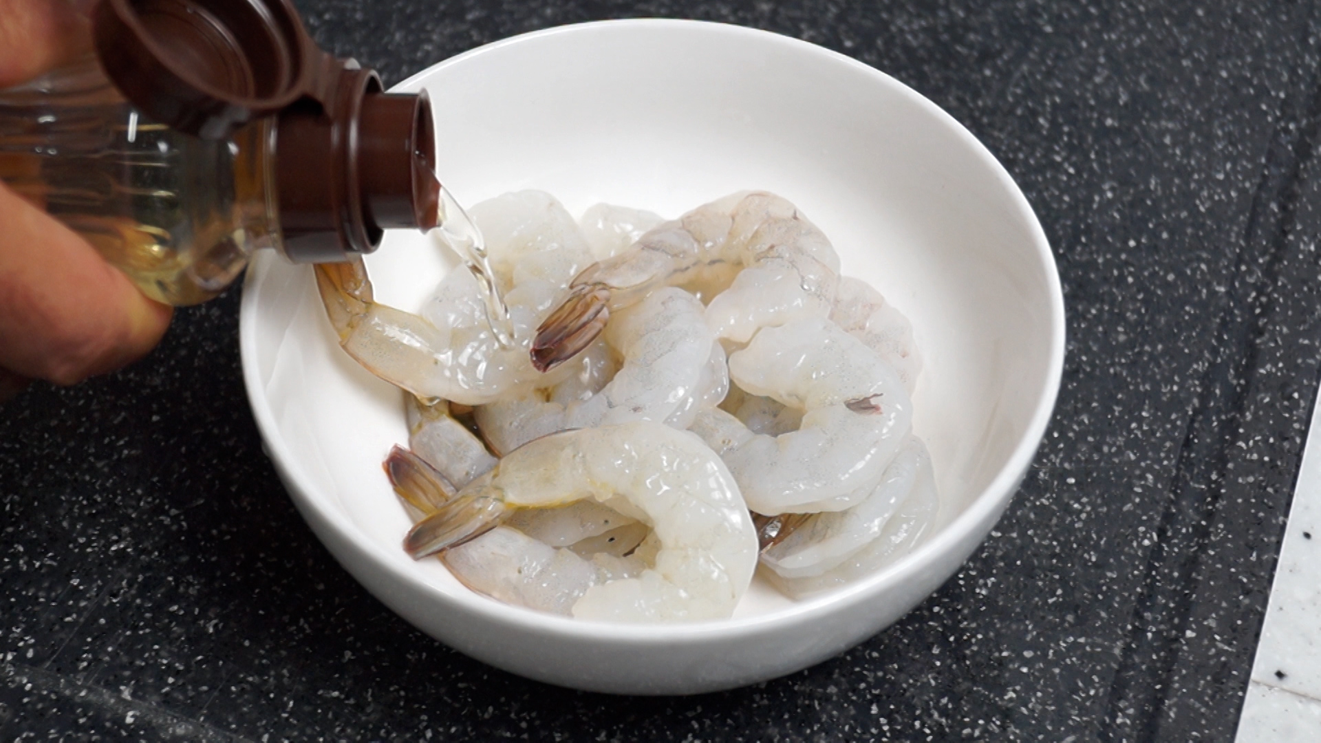 2. 새우에 밑간재료에 표기된 알콜도수 14% 미림 을 넣어주세요.