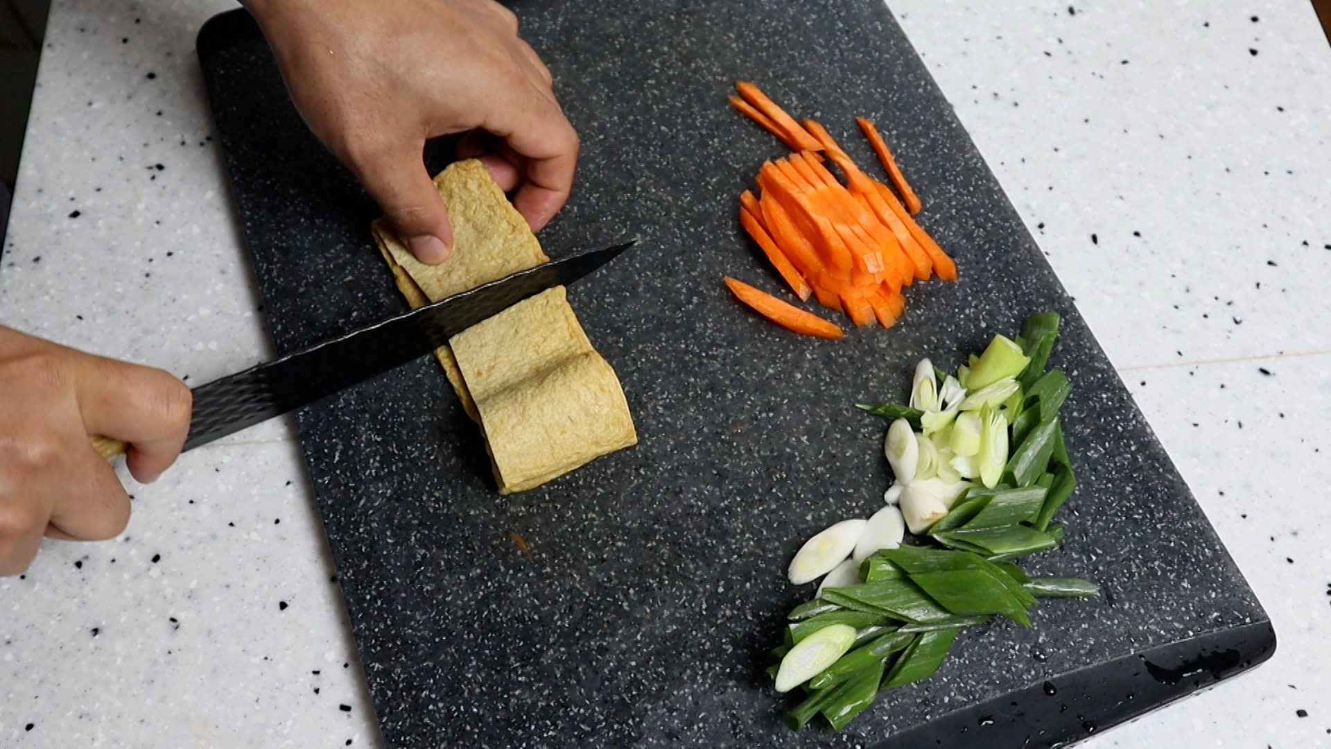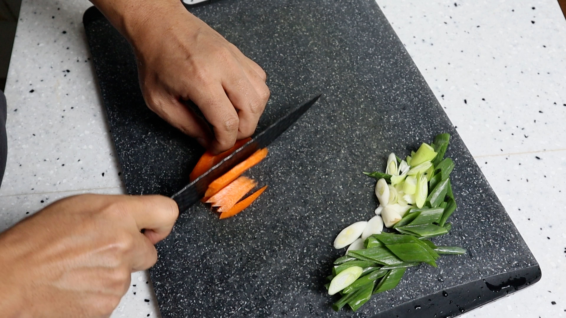 2. 당근은 의외로 떡볶이에 감칠맛을 더해주는 재료니 빼먹지 말고 3~4mm 로 채를 썰어 준비해주세요. 시장표 떡볶이에 당근과 파는 필수 랍니다!