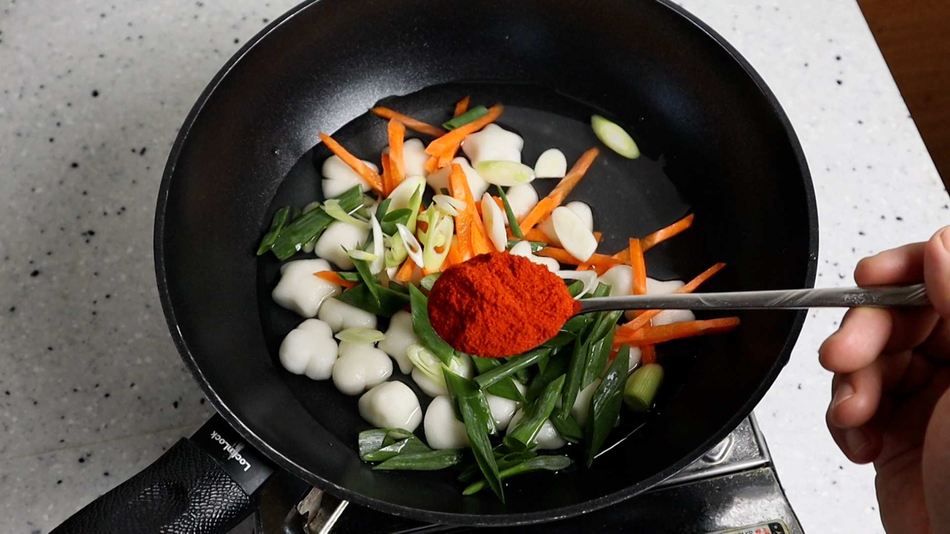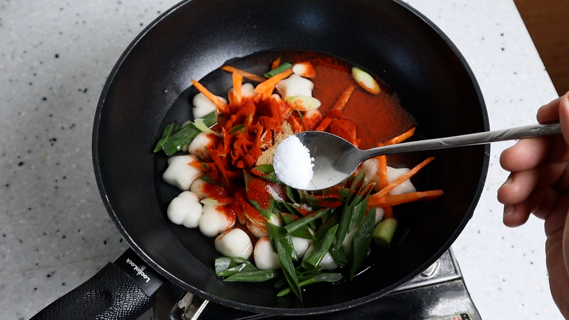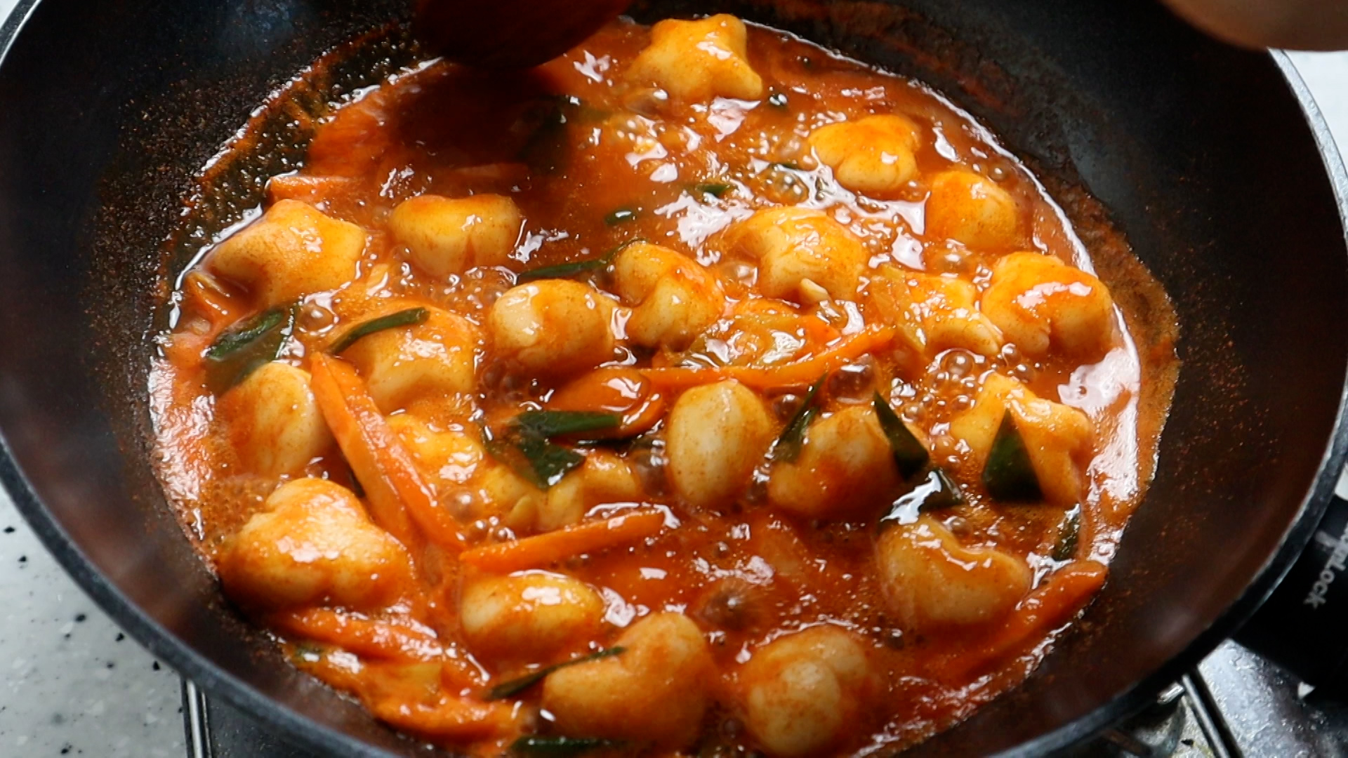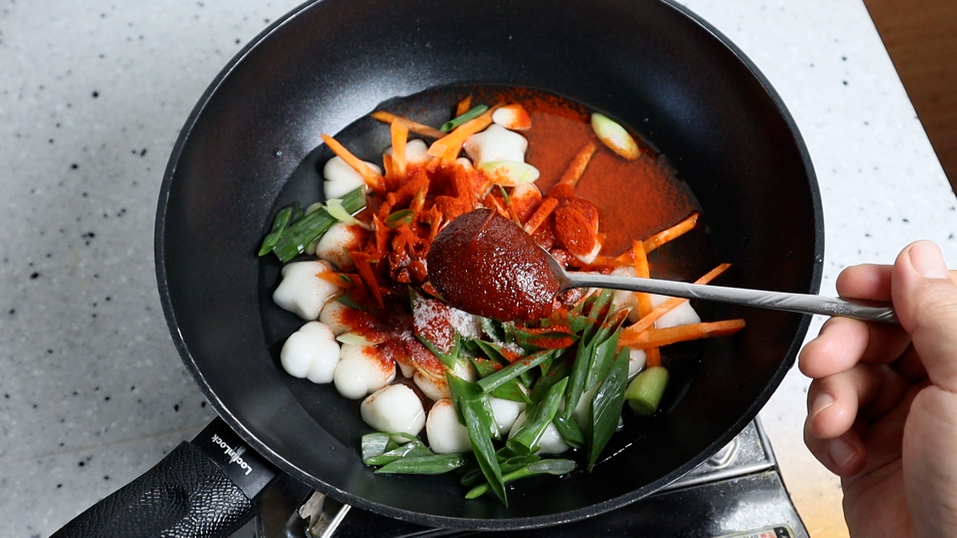 12. 떡볶이에 은은한 단맛과 윤기를 보태줄 물엿을 넣어주세요. 다른 당류 사용시 제품 특성에 따라 기호에 맞게 넣어주세요.