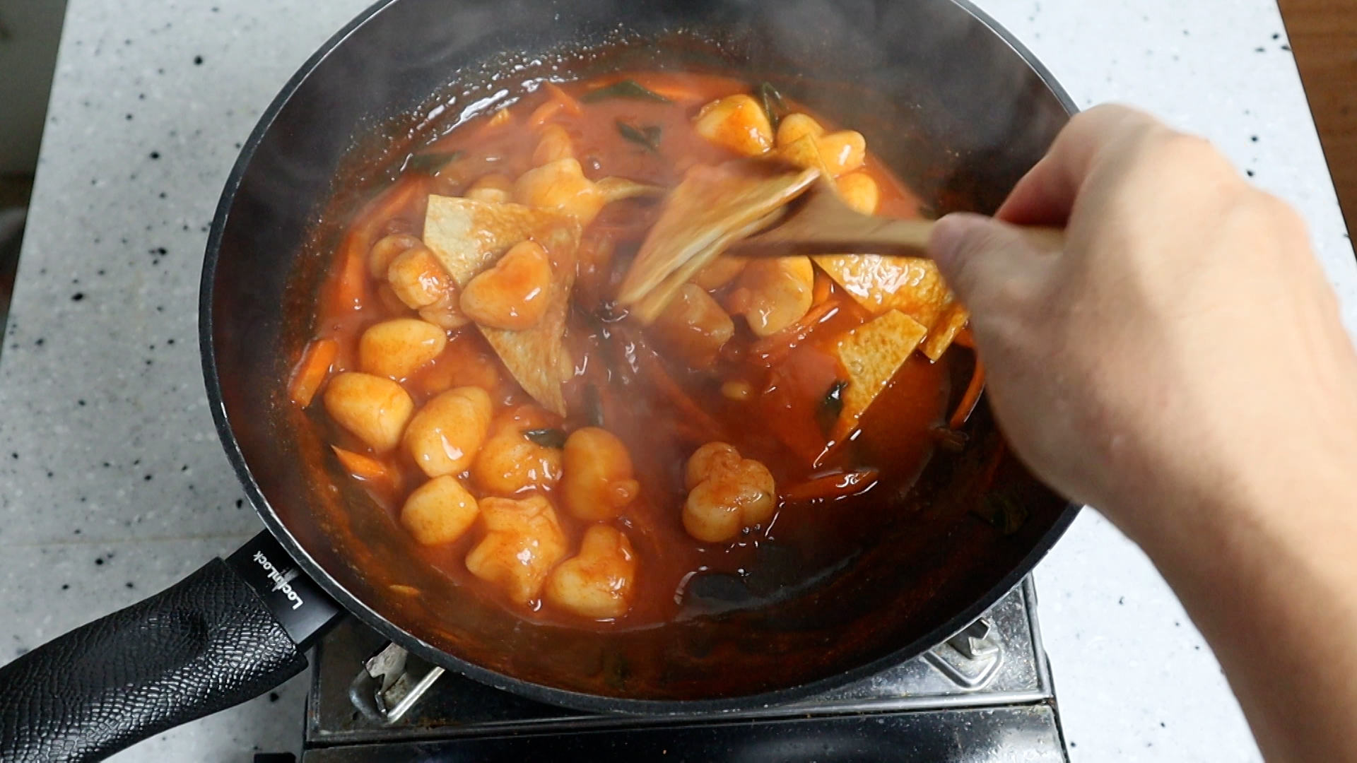 16. 어묵의 탱실한 식감과 어묵 특유의 맛을 그대로 즐기고 싶은분 들은 마무리 10초 전에 어묵을 넣고 골고루 섞어서 어묵을 살짝 데워 주세요. 의외로 떡복이 먹을때 어묵맛이 살아 있는걸 좋아하는 분들도 많더라고요.