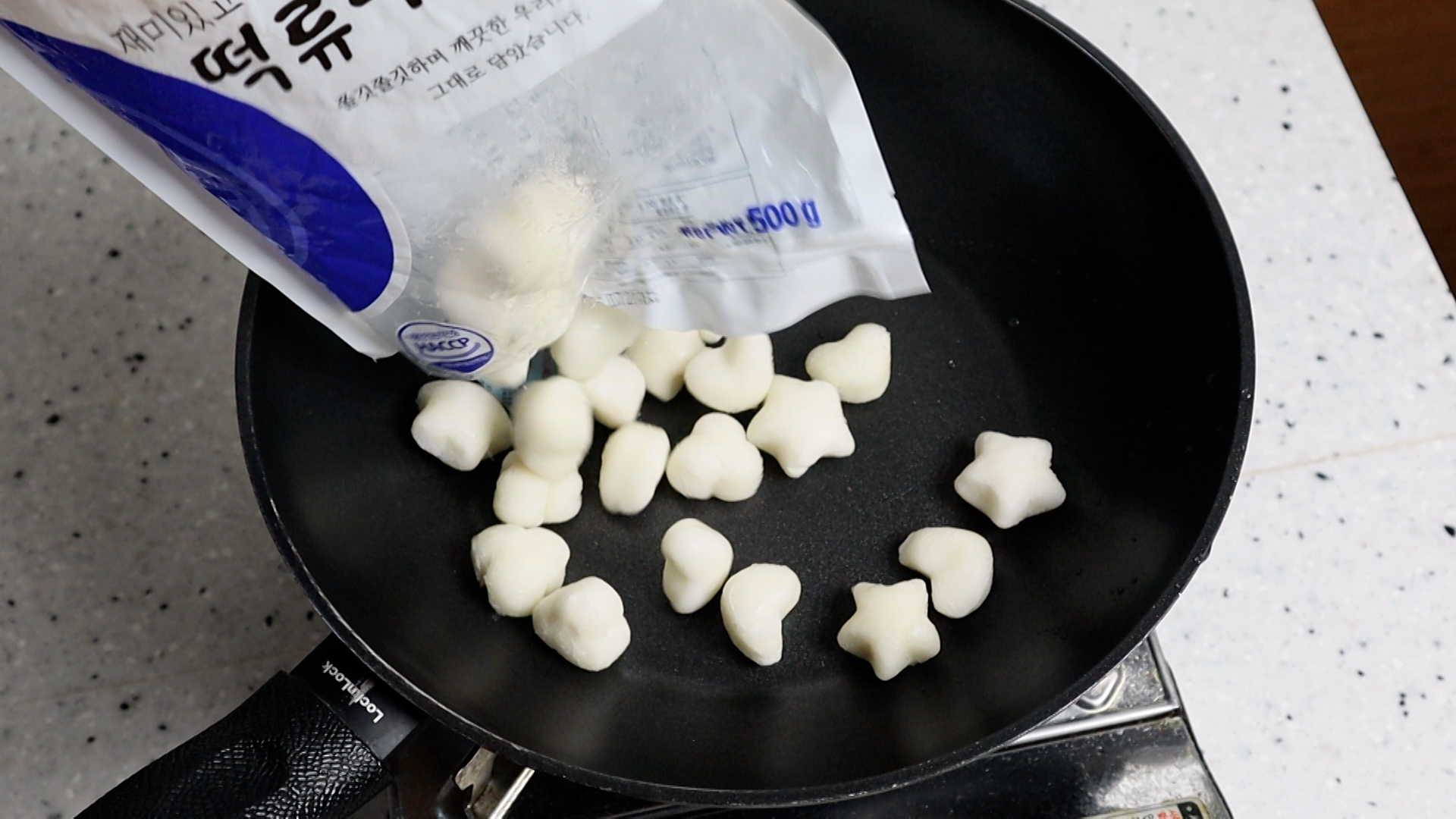 4. 팬에 떡을 넣어주는데 계란2개를 삶아 양념 찍어 드실분들은 떡 300g 떡볶이만 드실분들은 400g 넣어주세요.