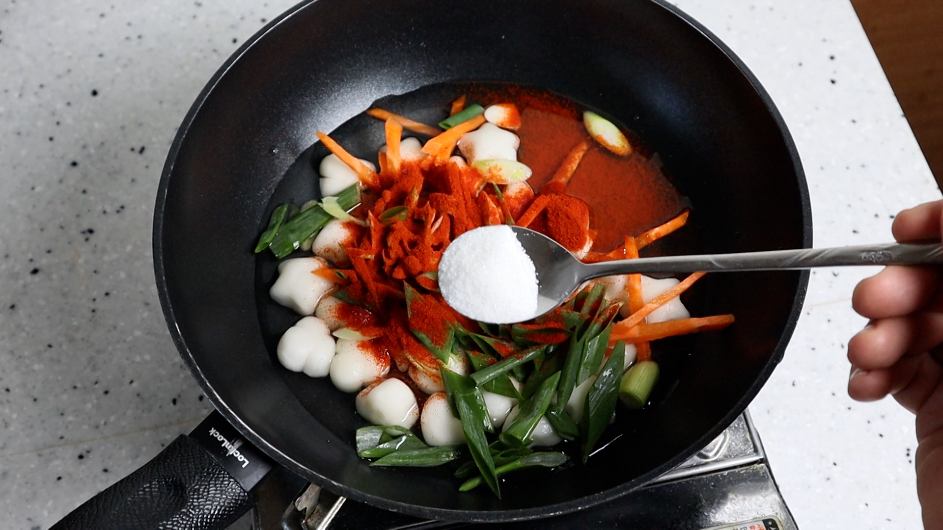 8. 설탕을 넣어주세요. 단맛이 좀 강한 떡볶이 스타일이시면 반스푼 더 넣으셔도 됩니다.