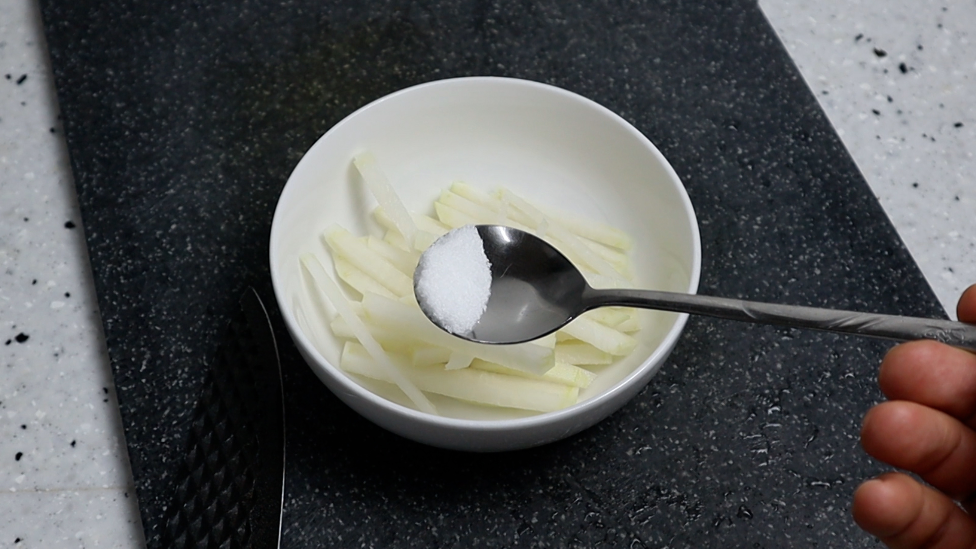 2. 절이기 재료를 무에 넣어주세요. 설탕은 깍아서 넣으세요.