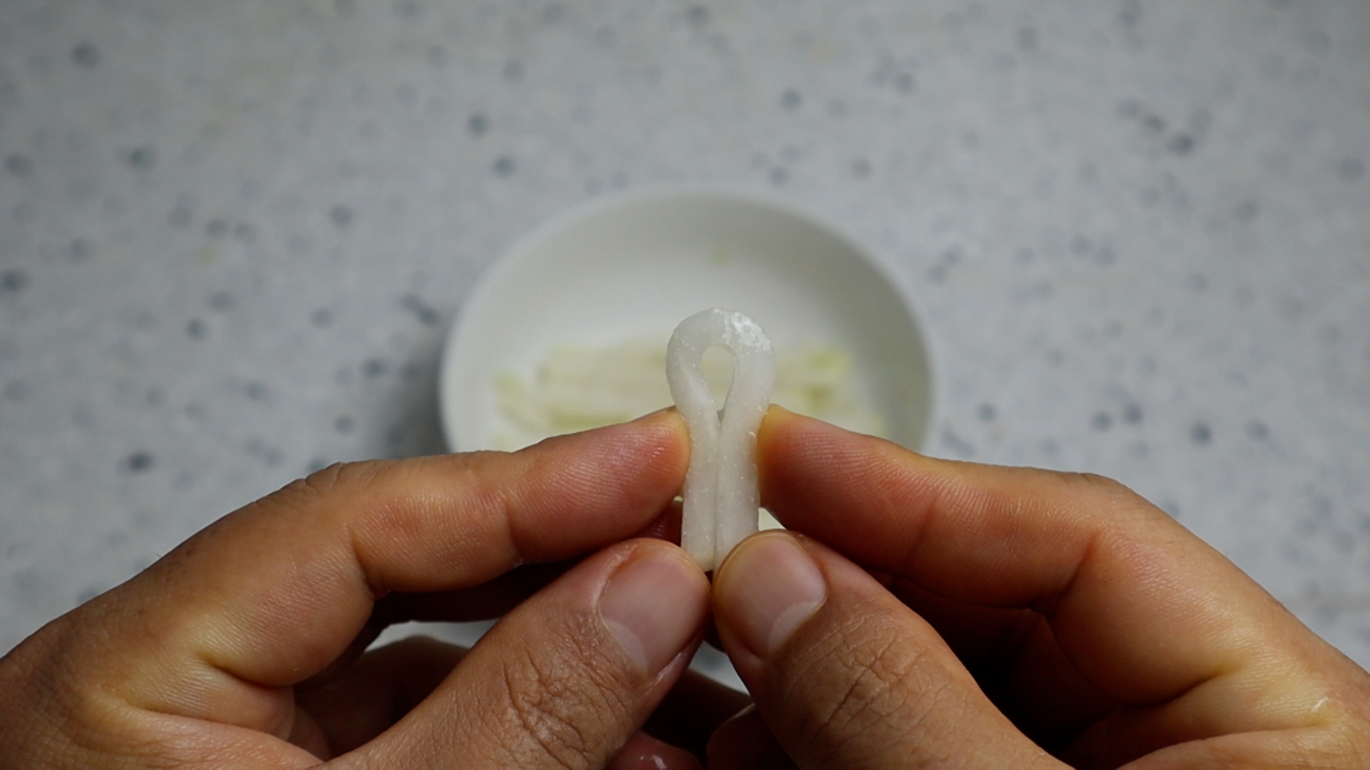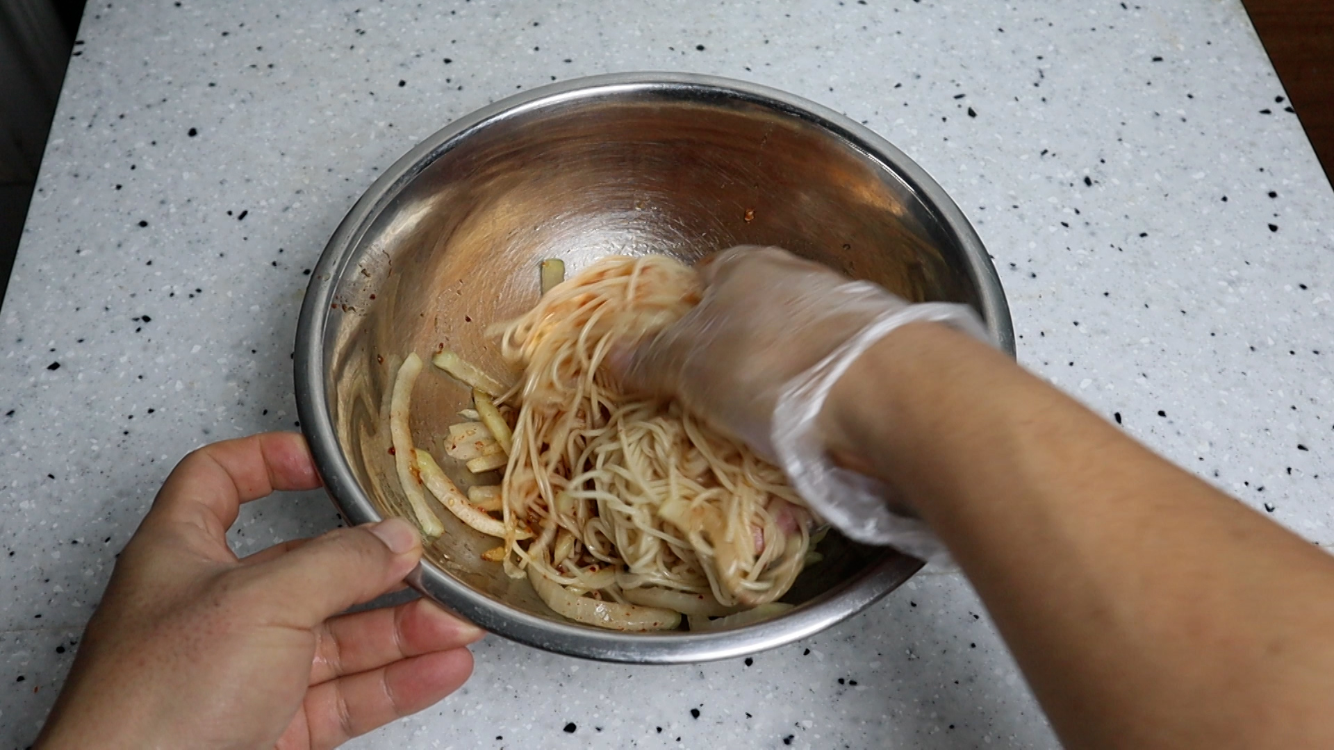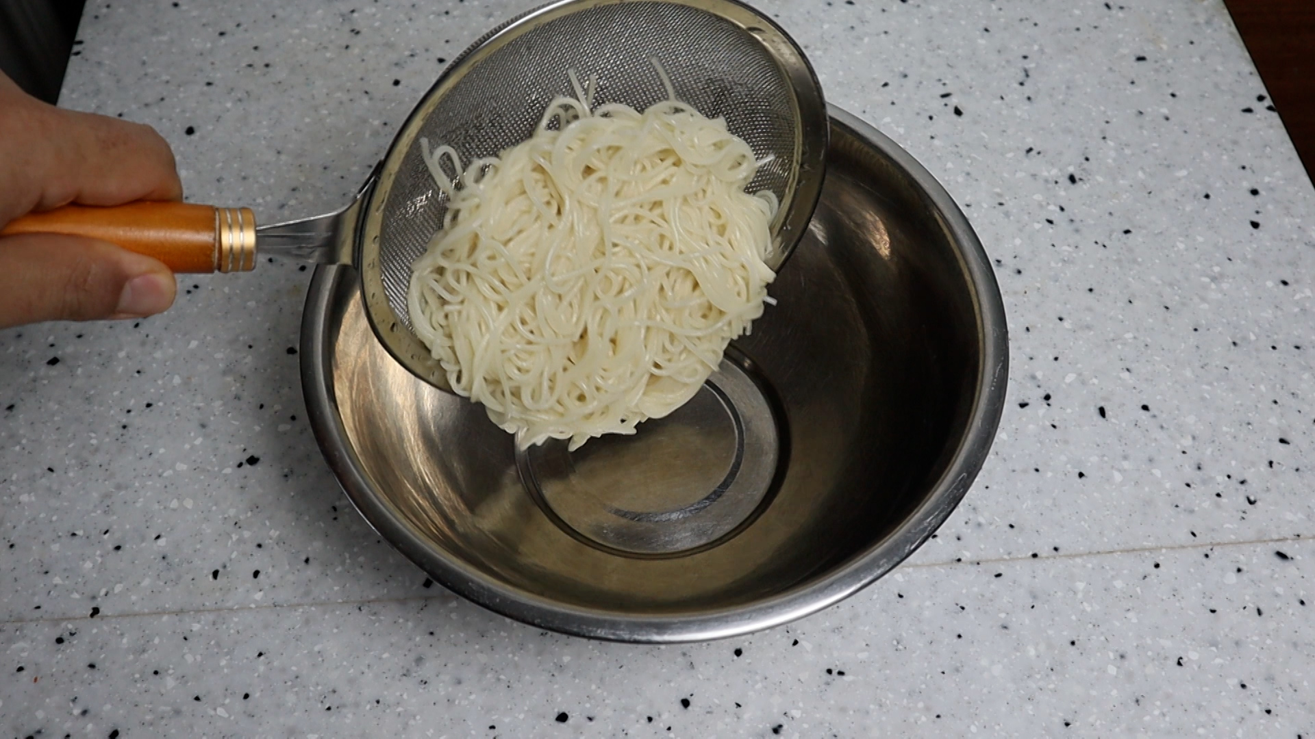 19. 국수 1인분을 삶아 찬불에 박박 씻어 전분을 날리고 물기를 꽉! 짜서 준비해주세요.
