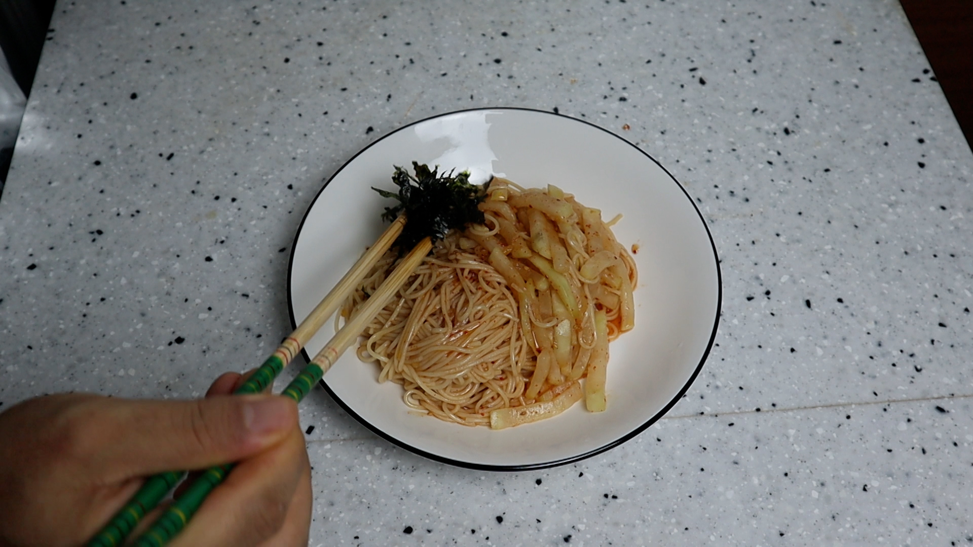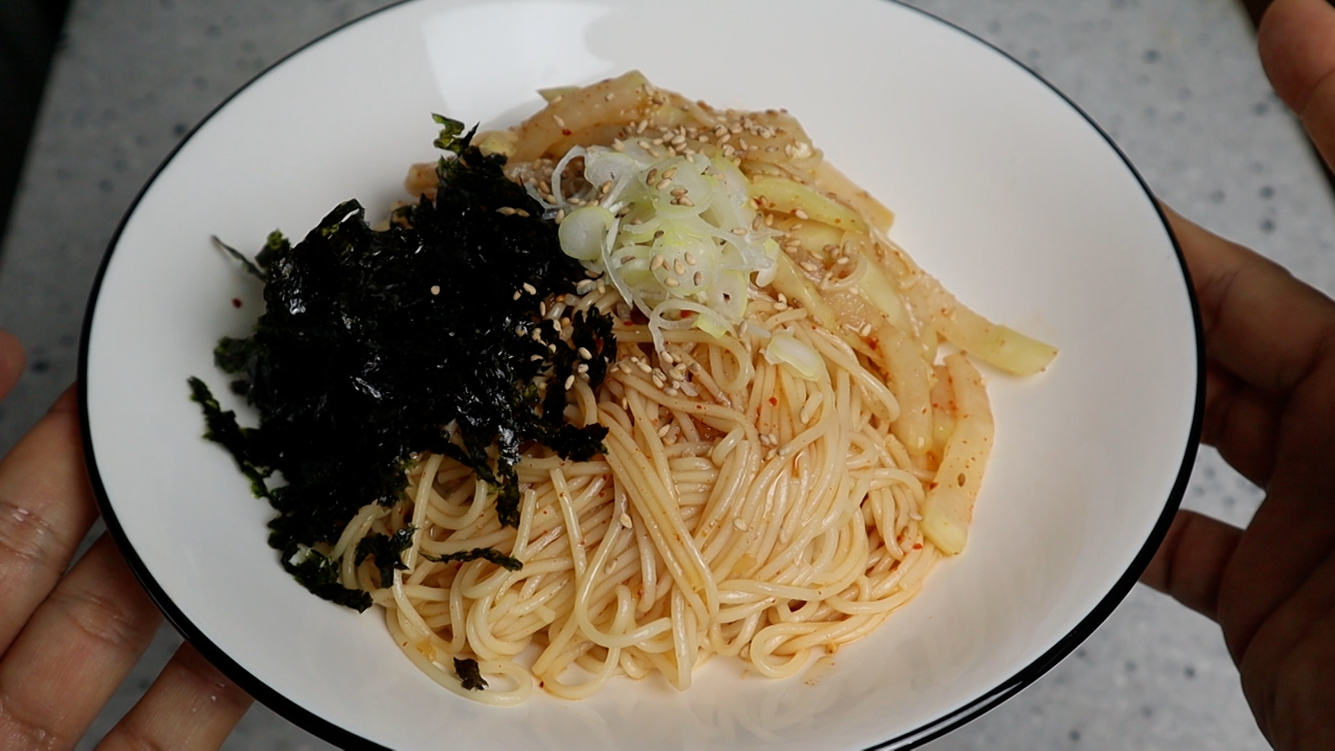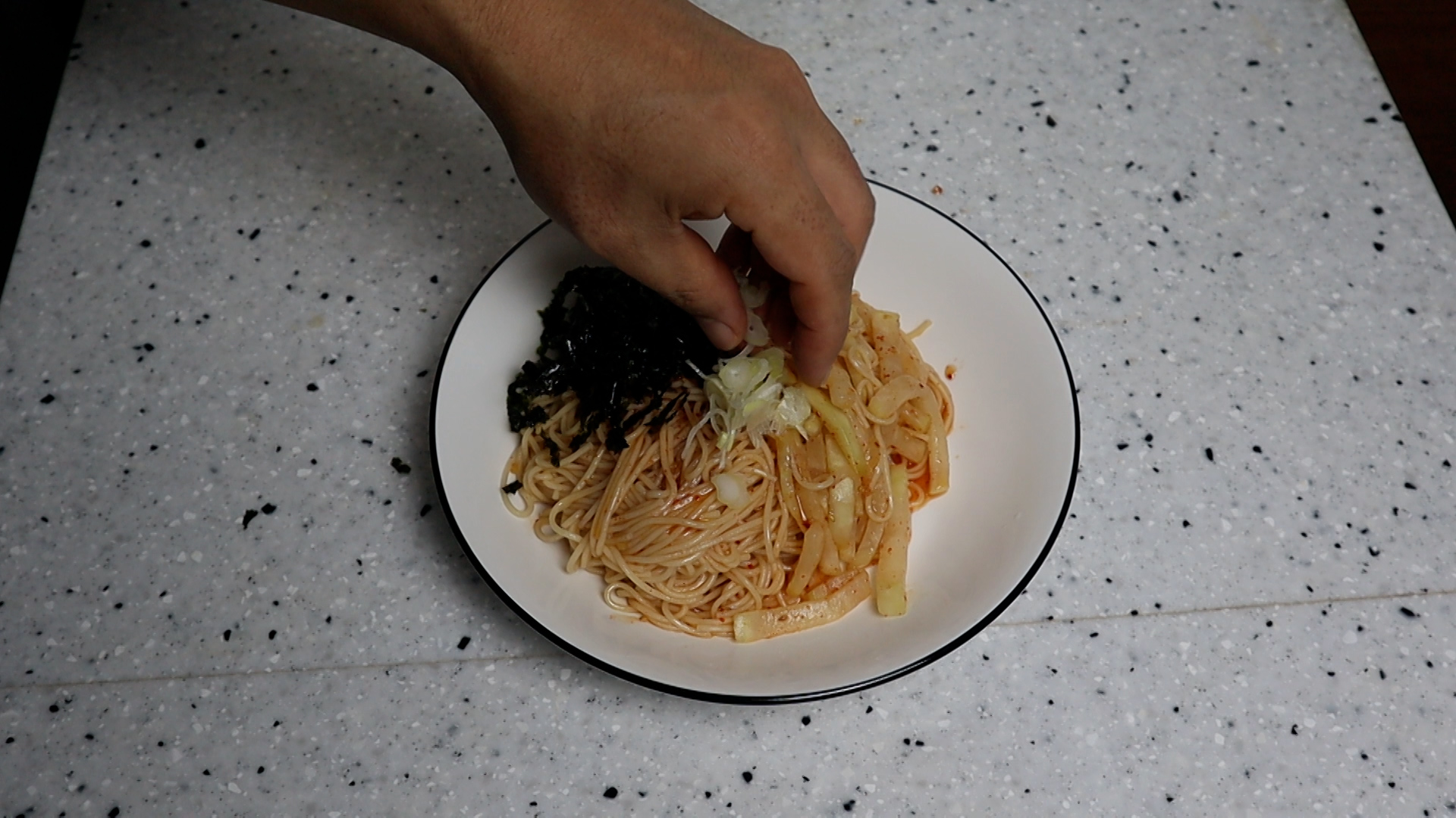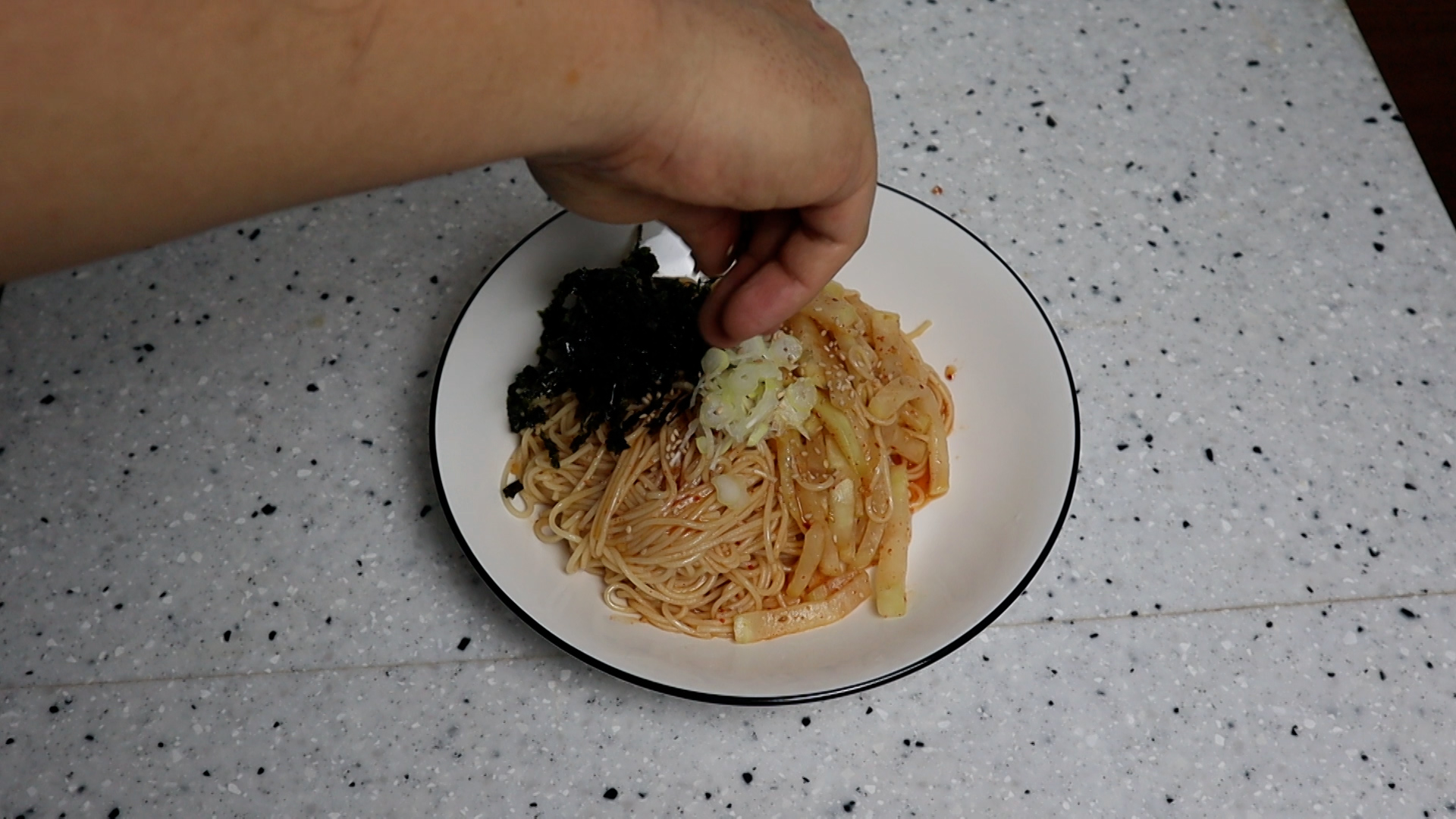 22. 접시에 비빈 국수를 담고 기호에 따라 김가루를 조금 올려주세요.