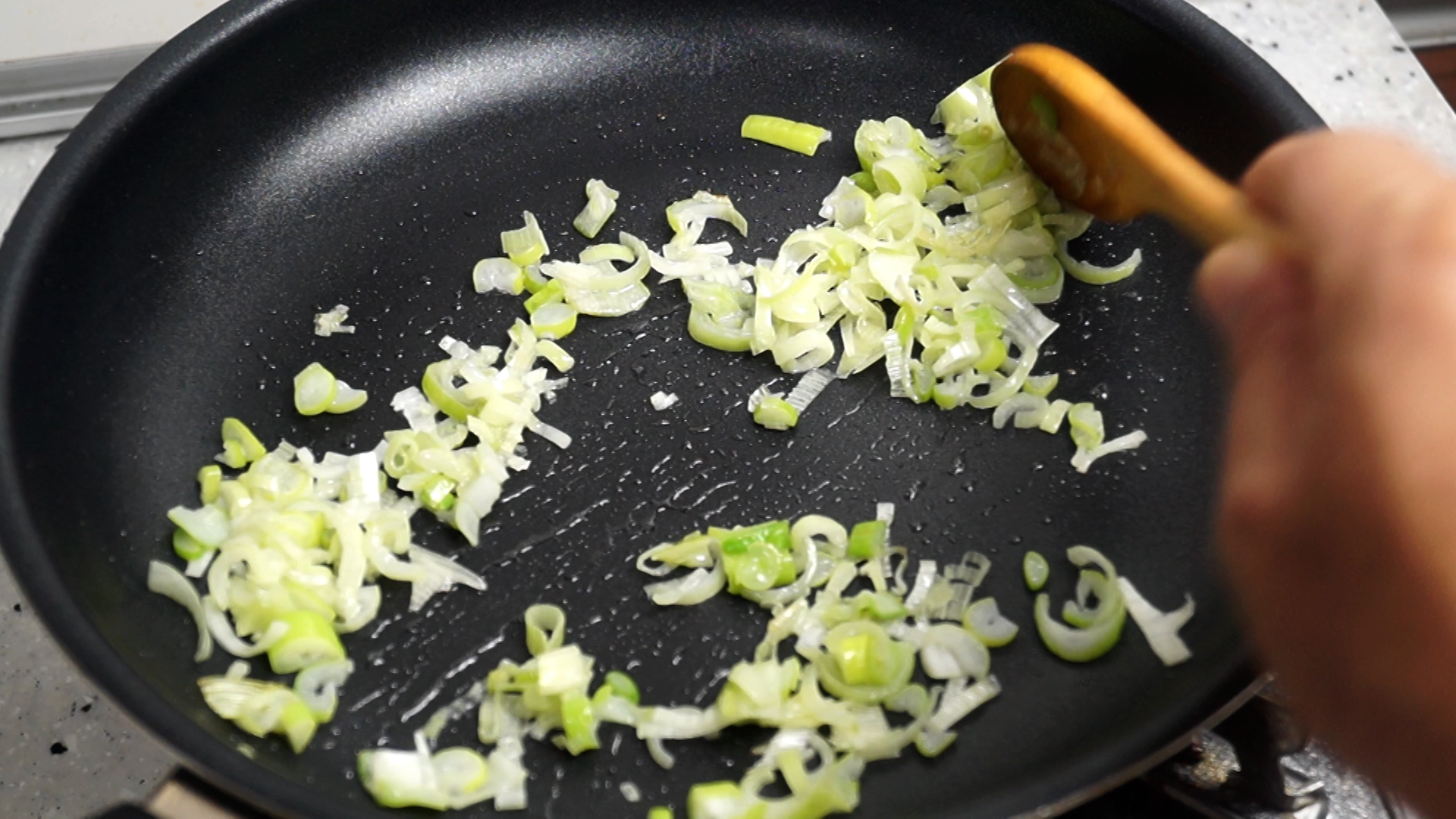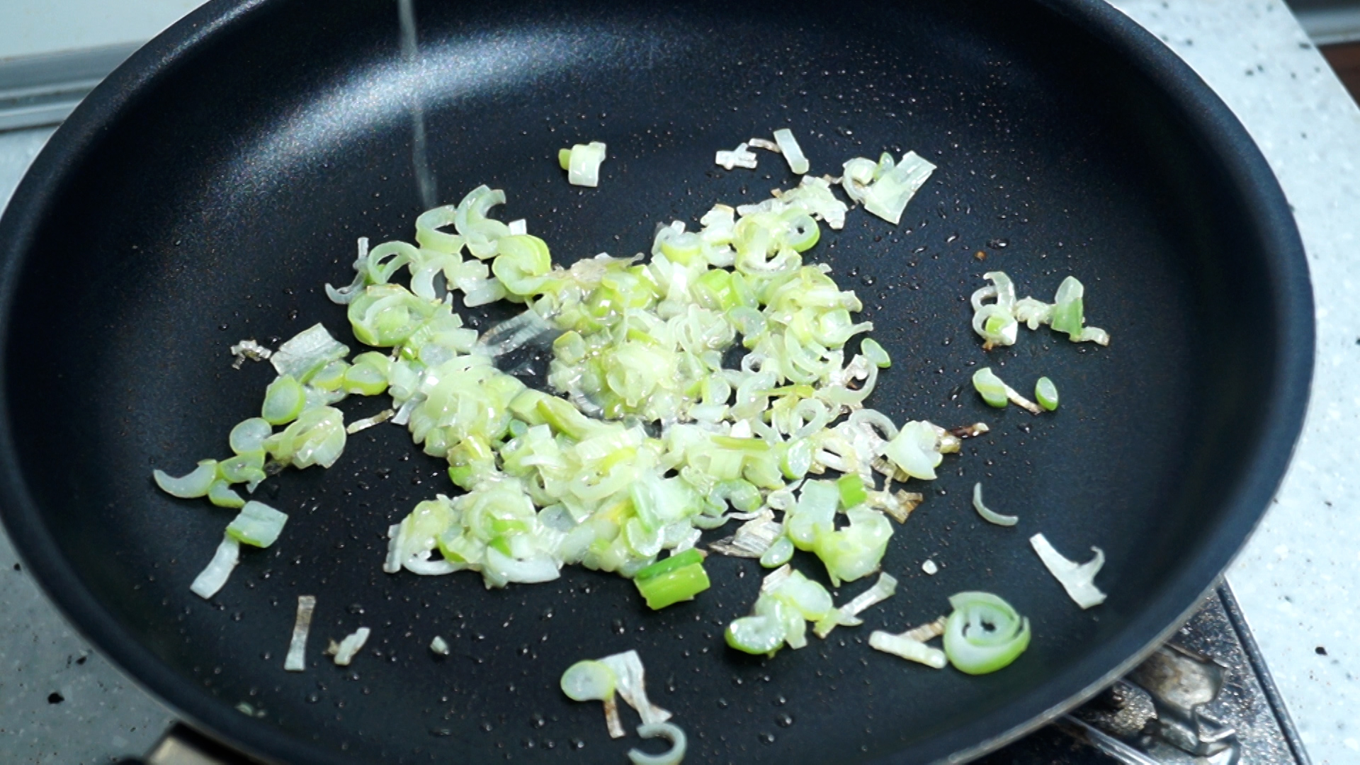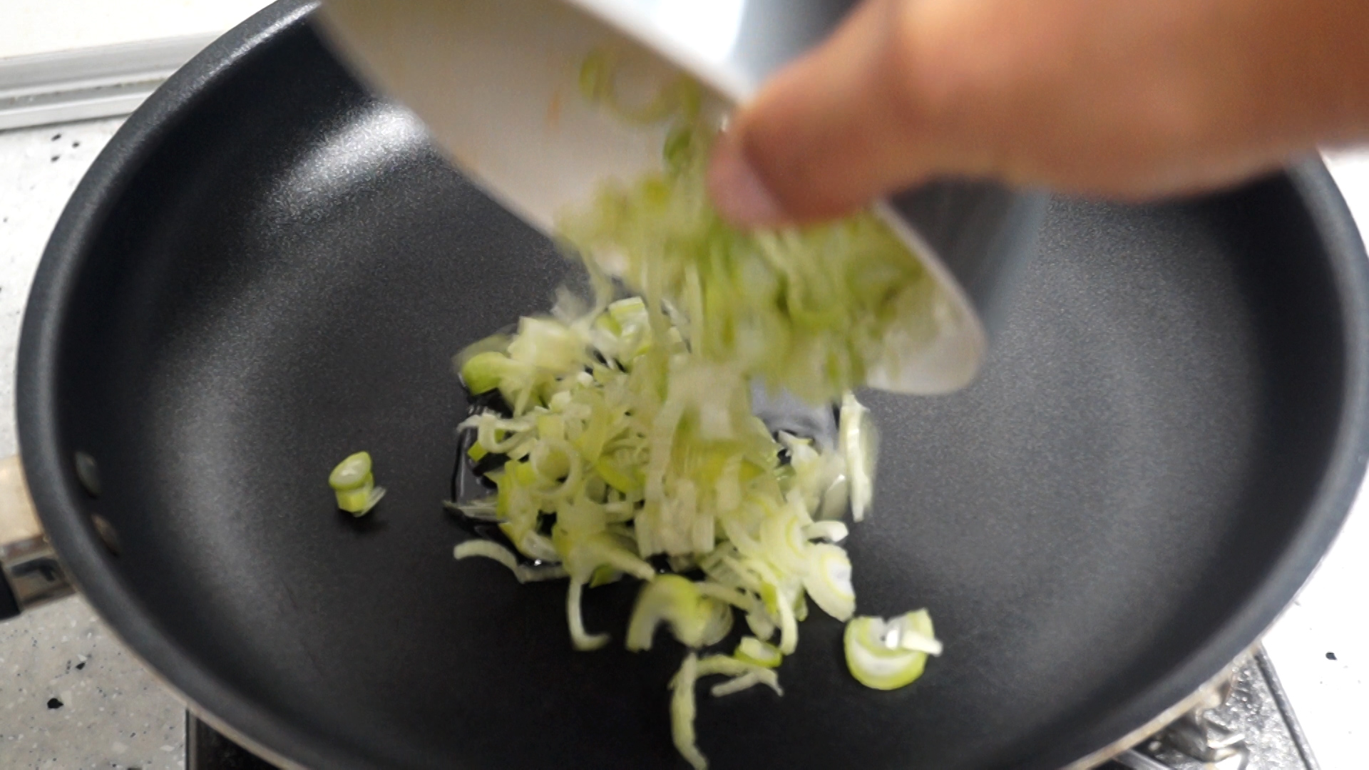5. 팬에 식용유를 부은 다음 대파를 넣어주세요.