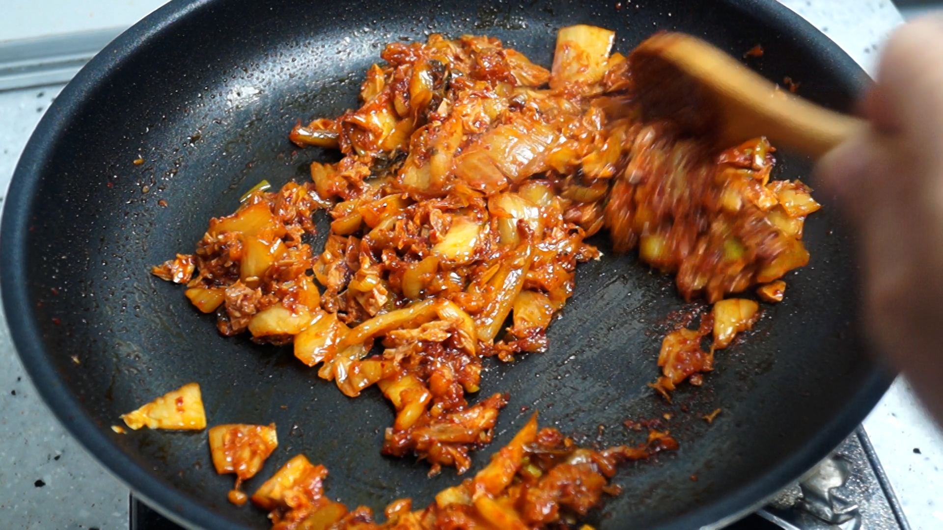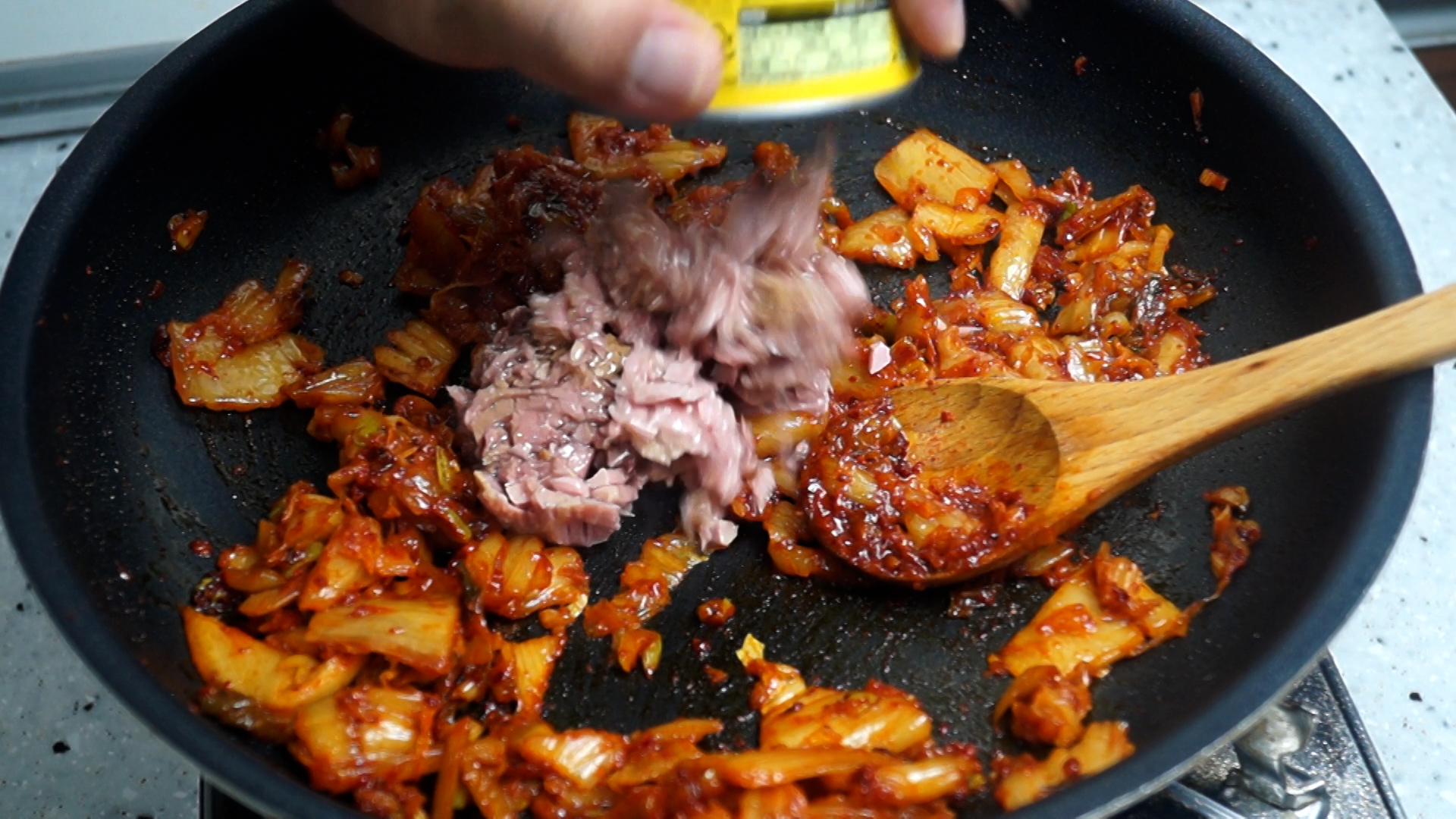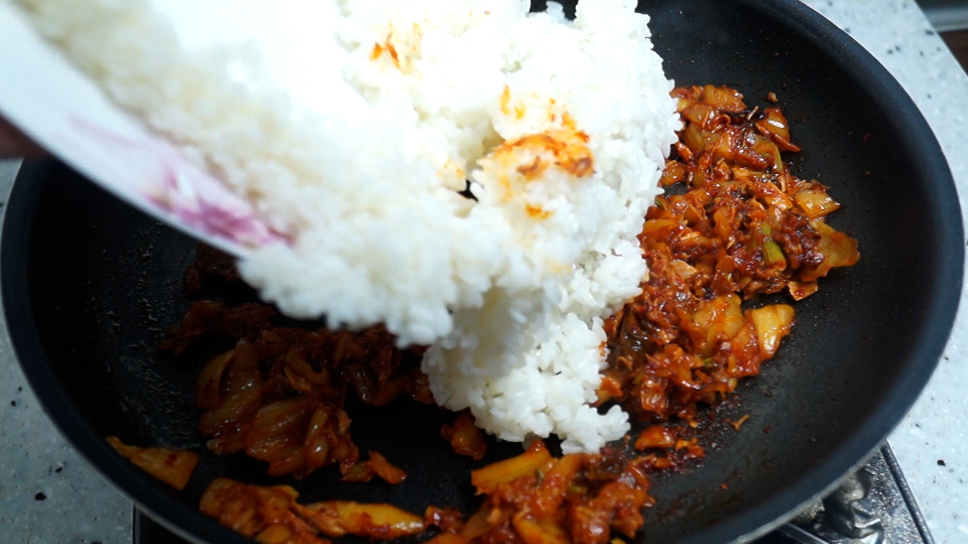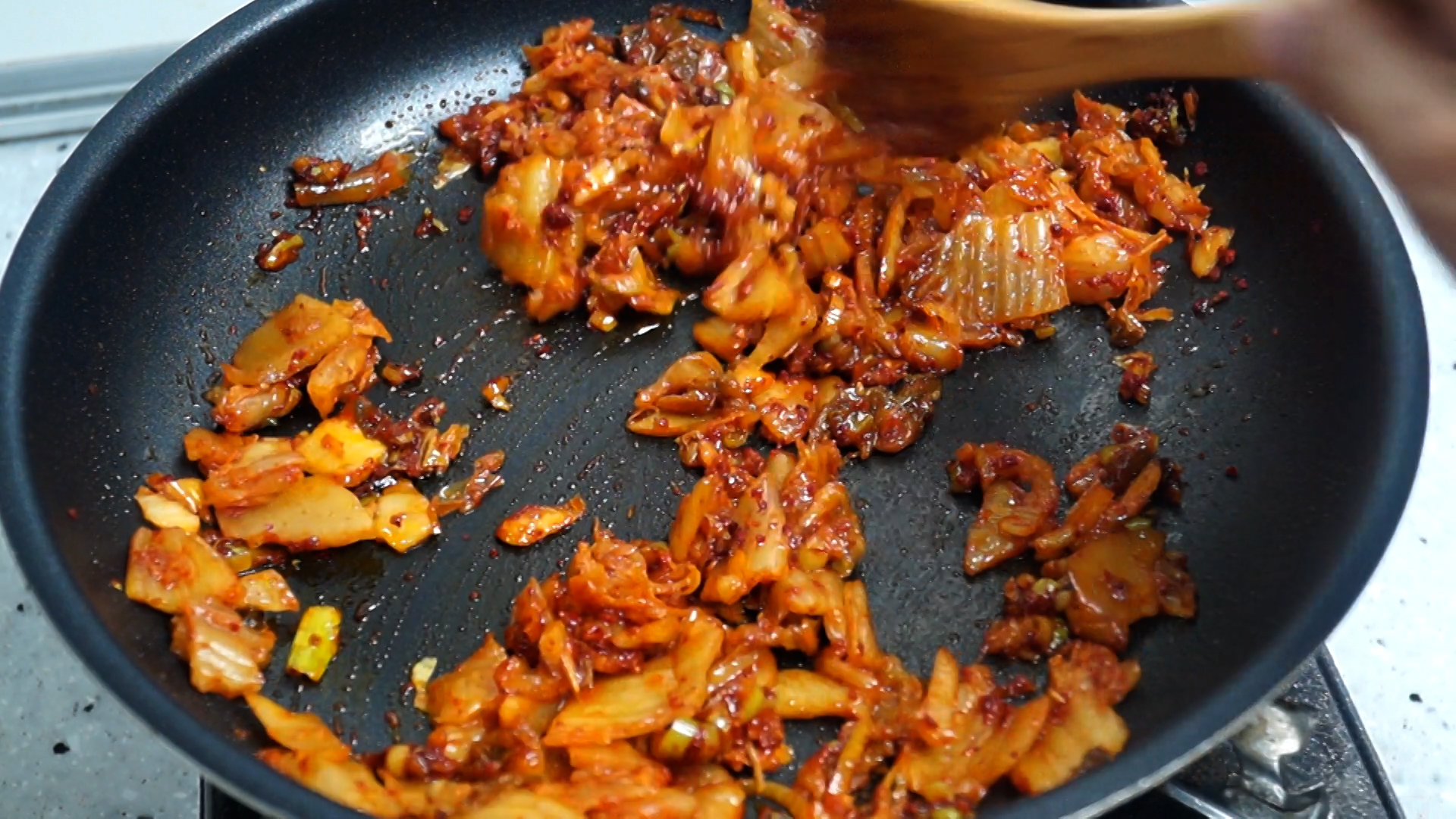 12. 김치를 부어준 다음에 중불에 2분 정도 볶아주세요.