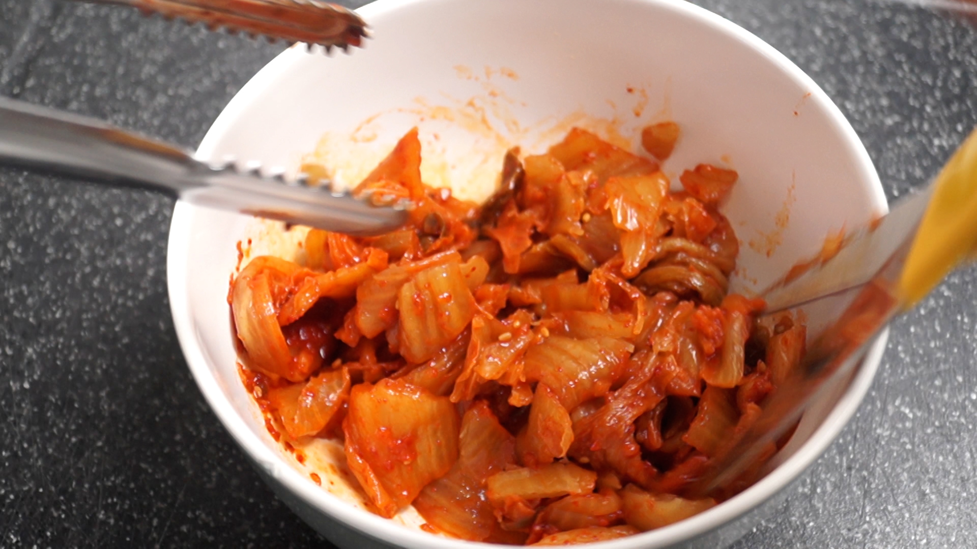 2. 적당히 익은 김치를 먹기 좋게 잘게잘게 잘라주세요. 김치는 국물이 촉촉해야 합니다. 국물이 너무 없으면 김치국물을 1~2스푼 넣어주세요.