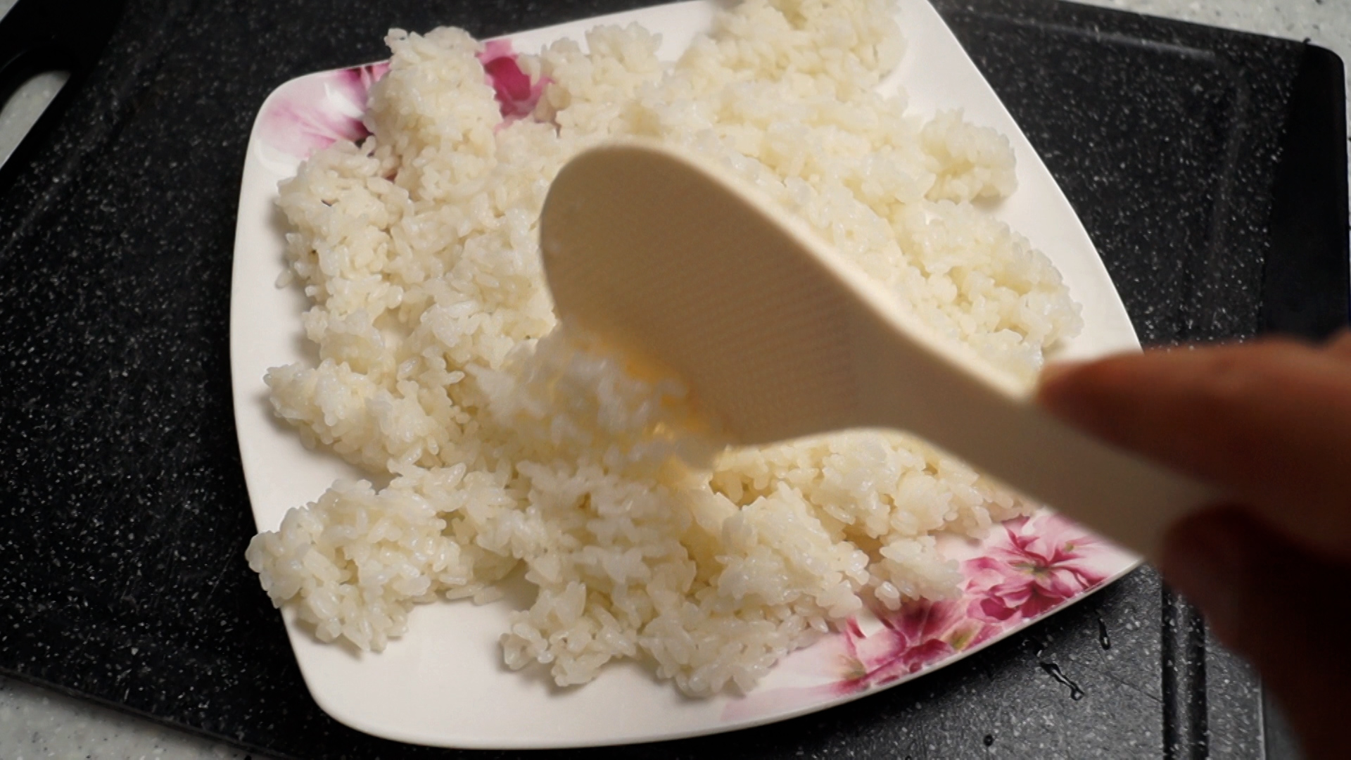 1. 밥은 접시에 펼쳐 살짝 식혀주세요. 살짝 식혀서 볶으면 볶음밥이 더 맛있답니다.