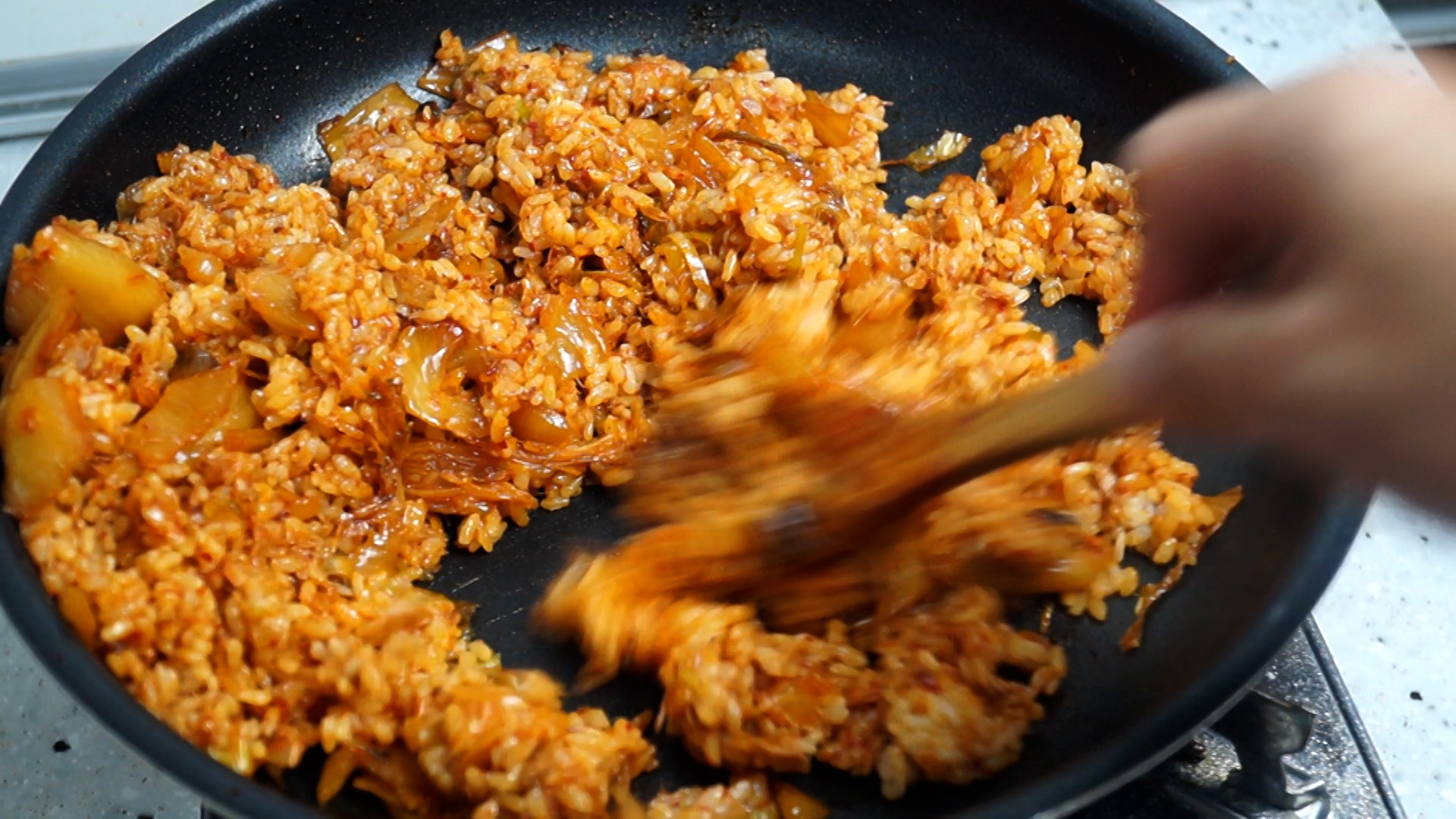 16. 불을 강불로 바꾸고 1분 30초 정도 골고루 섞으며 볶아주세요.