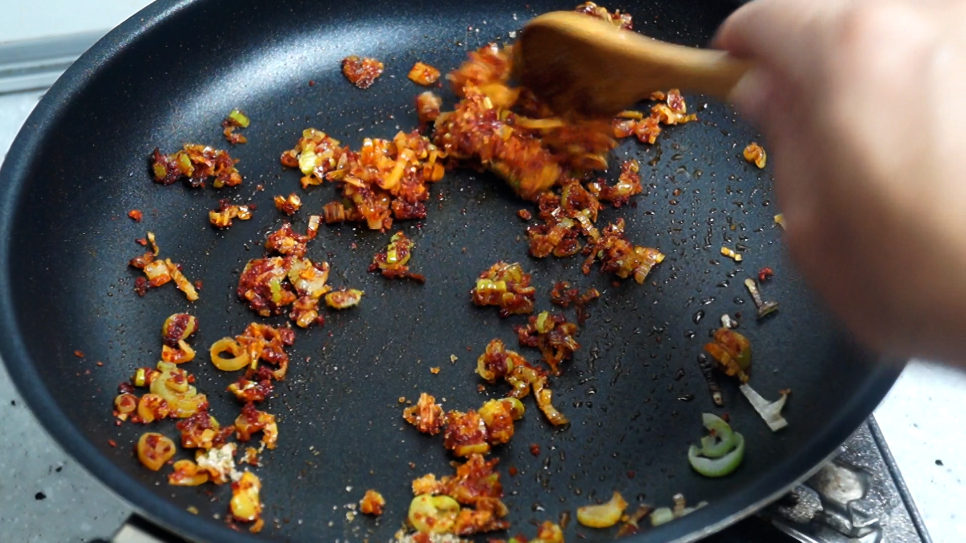 6. 중약불에 자글거리기 시작하면 2분 정도를 볶아주세요.