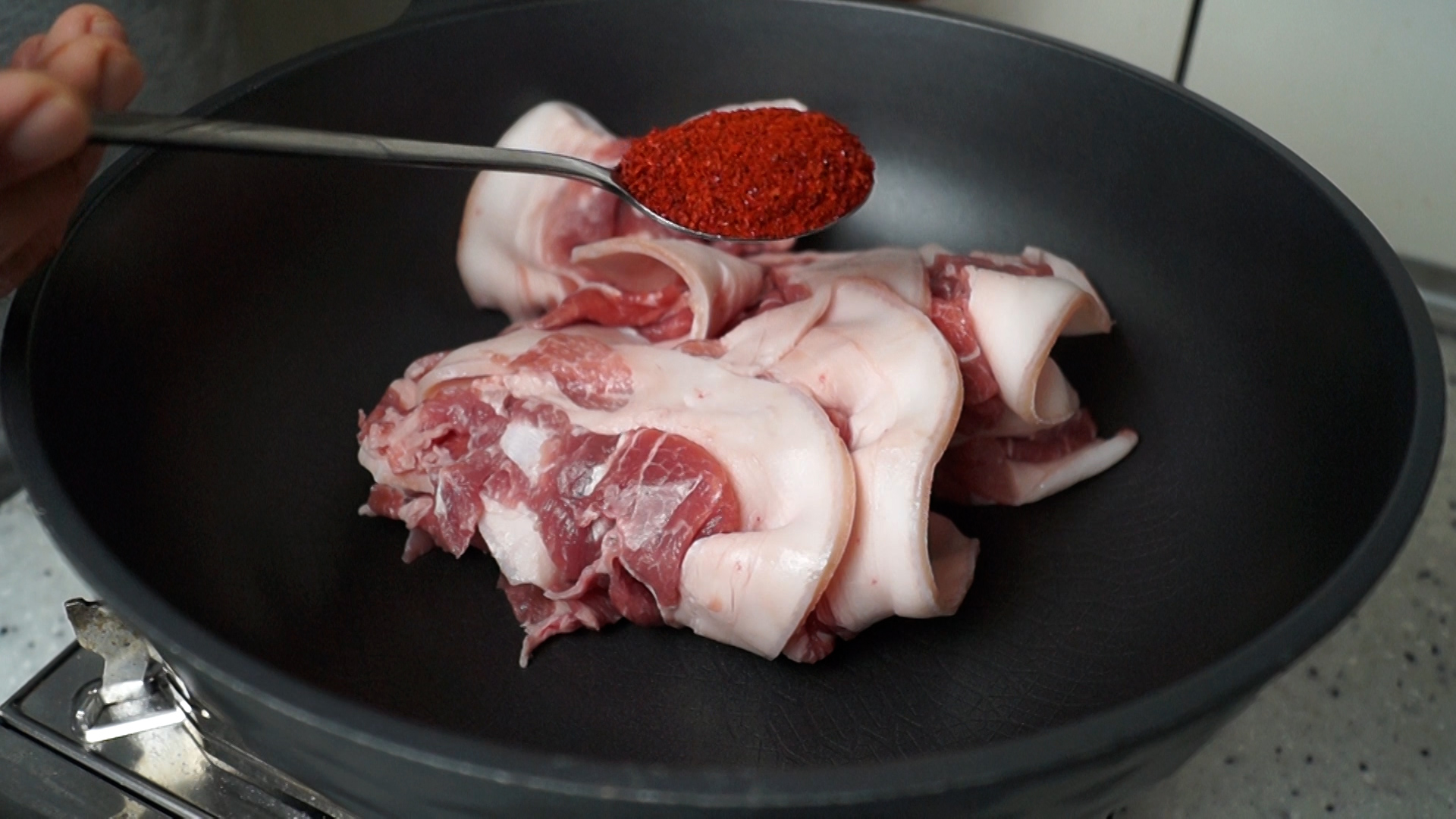 2. 돼지고기 앞다리살을 제육용으로 얇은걸 웍에 넣어주세요.