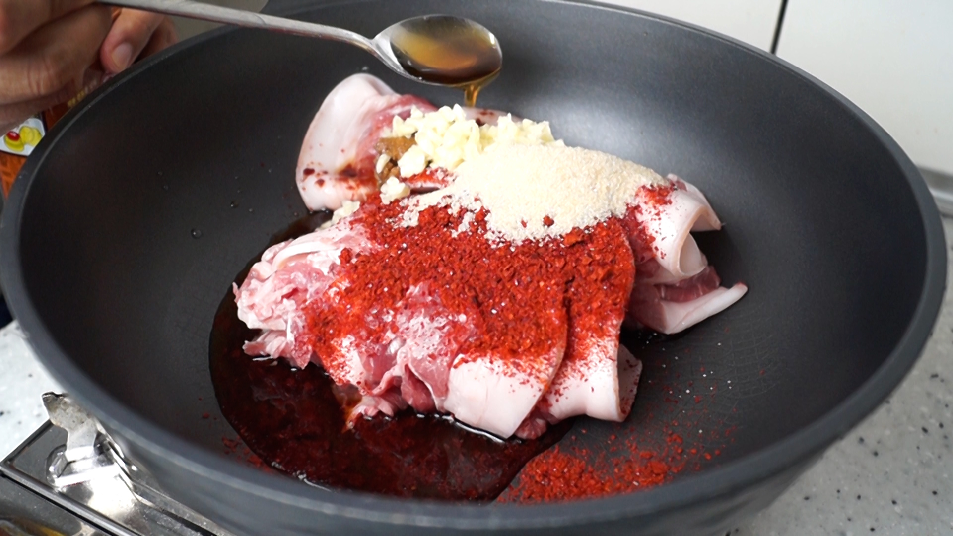 3. 양념란에 재료를 바로 부어주세요. 고기를 한번 굽고 하면 더 맛있는데 간단하게 할꺼라 바로 양념을 넣었습니다. 고춧가루는 중간입자 고춧가루 사용해주세요.