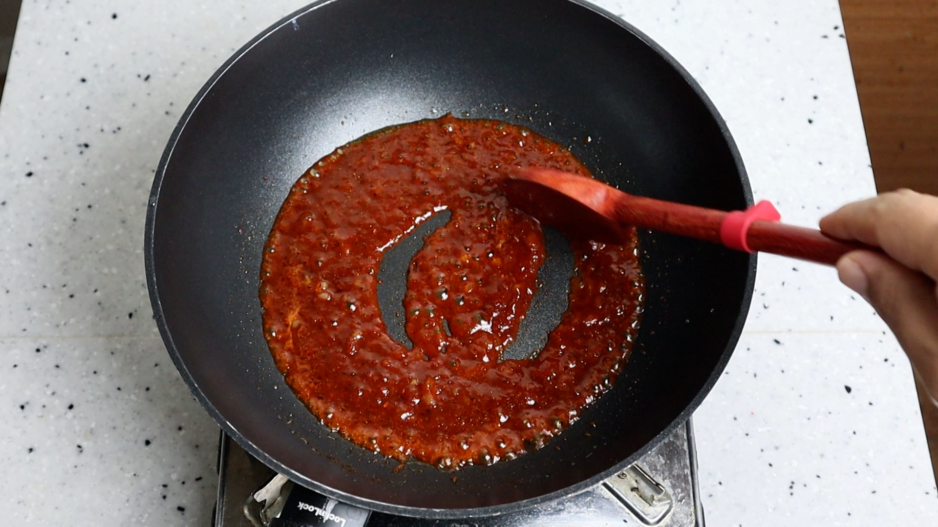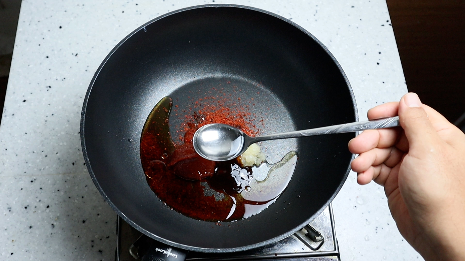 11. 식용유를 양념에 넣어주세요. 식용유가 들어가면 양념이 튀겨지듯 볶아지며 더 진하고 맛있어집니다.