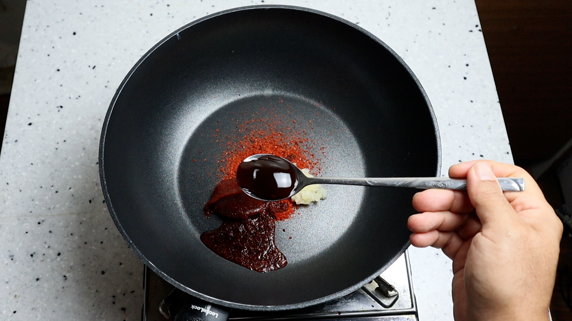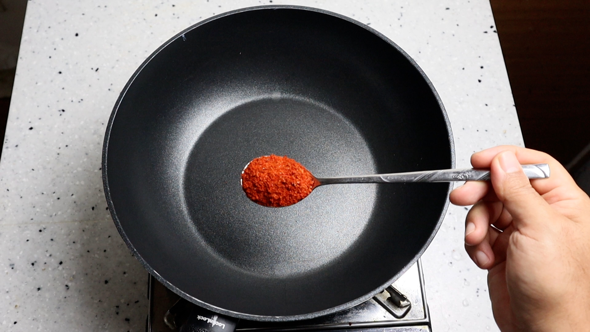 4. 웍이나 팬을 준비해서 고춧가루를 넣어주세요.
