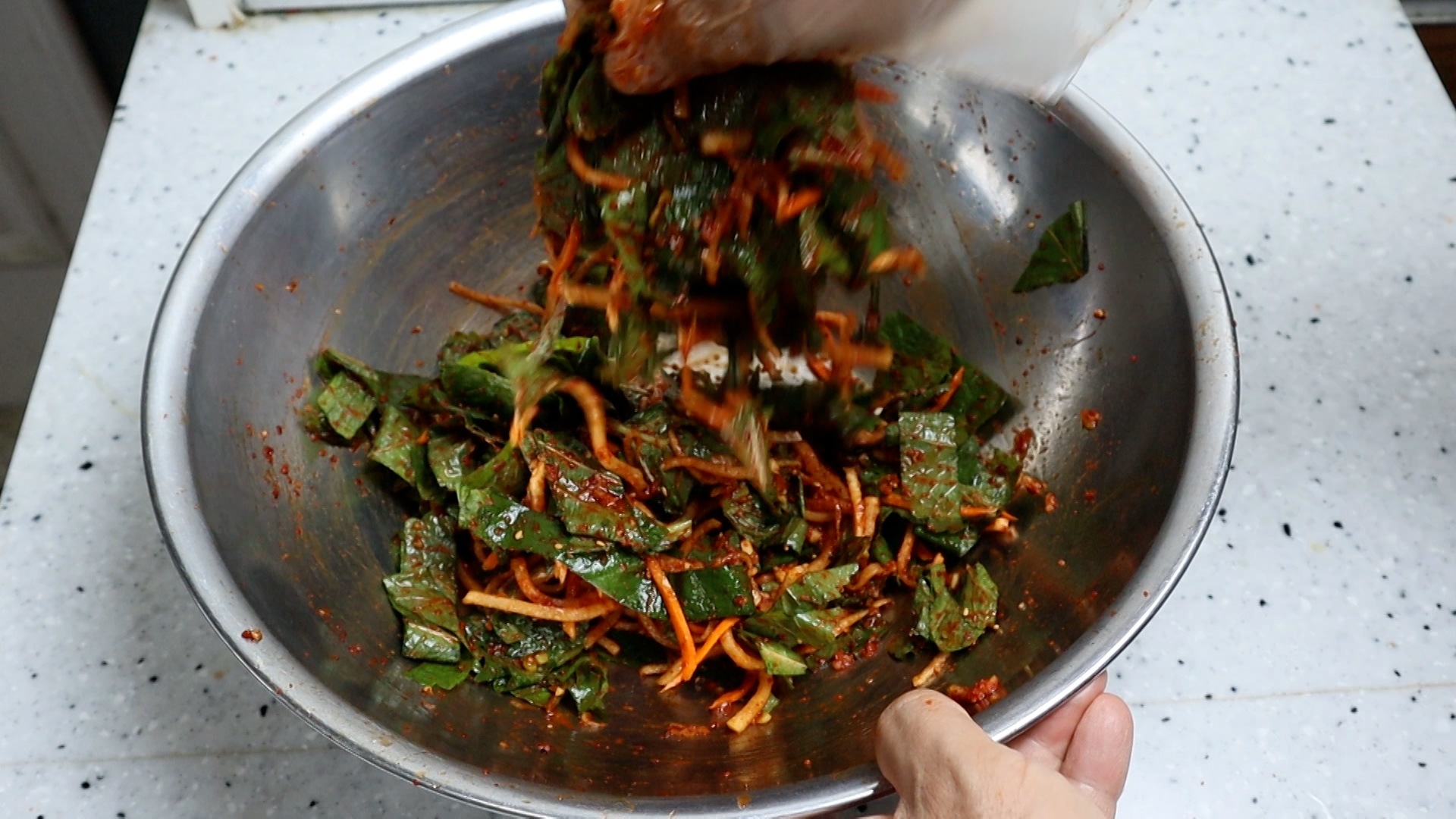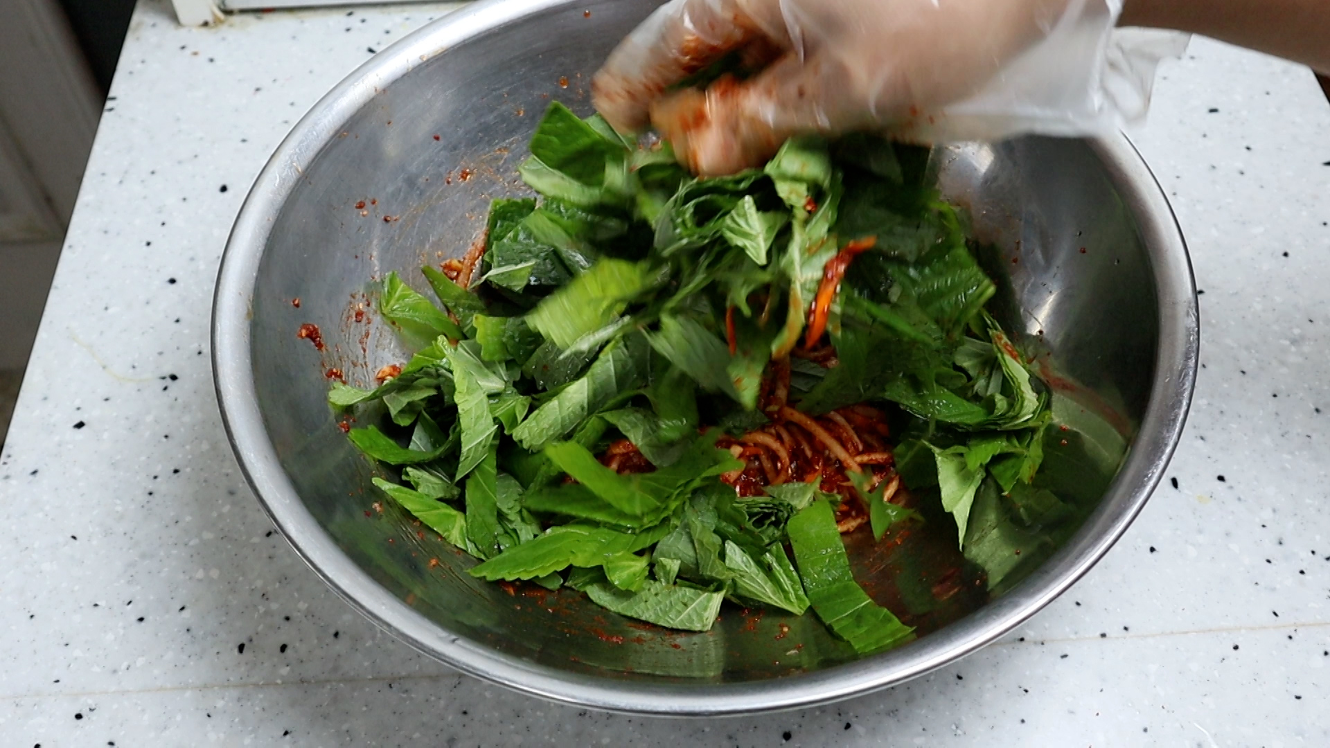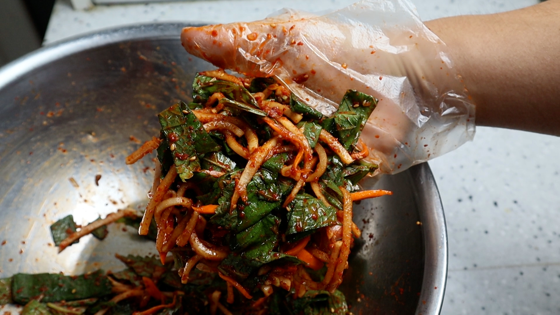 20. 잘 흩어 주셨으면 양념과 무,당근이 깻잎 사이사이 들어가게 버무려주세요.