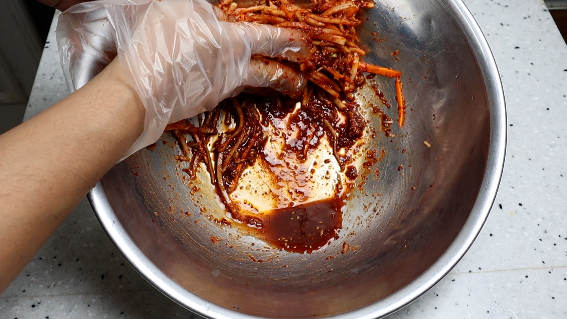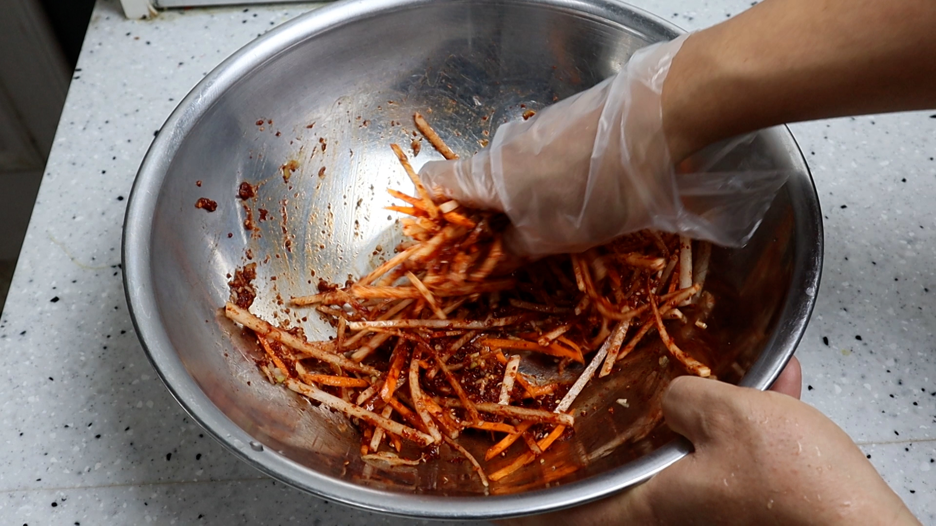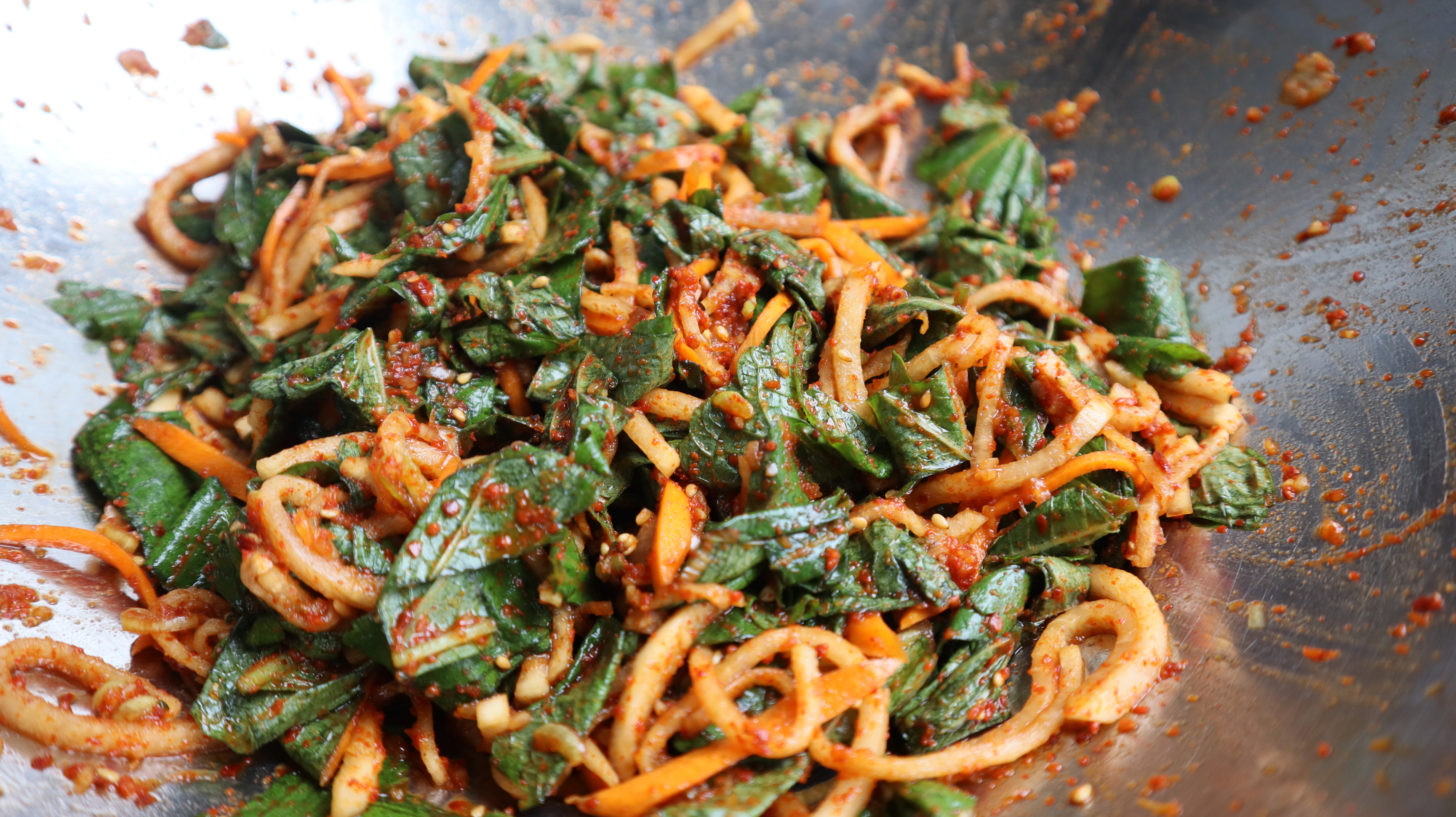 20. 잘 흩어 주셨으면 양념과 무,당근이 깻잎 사이사이 들어가게 버무려주세요.