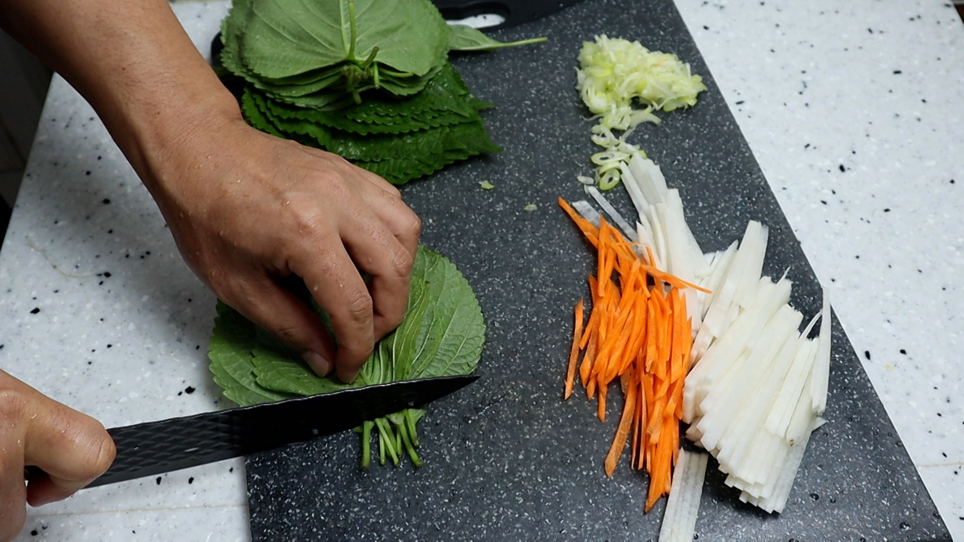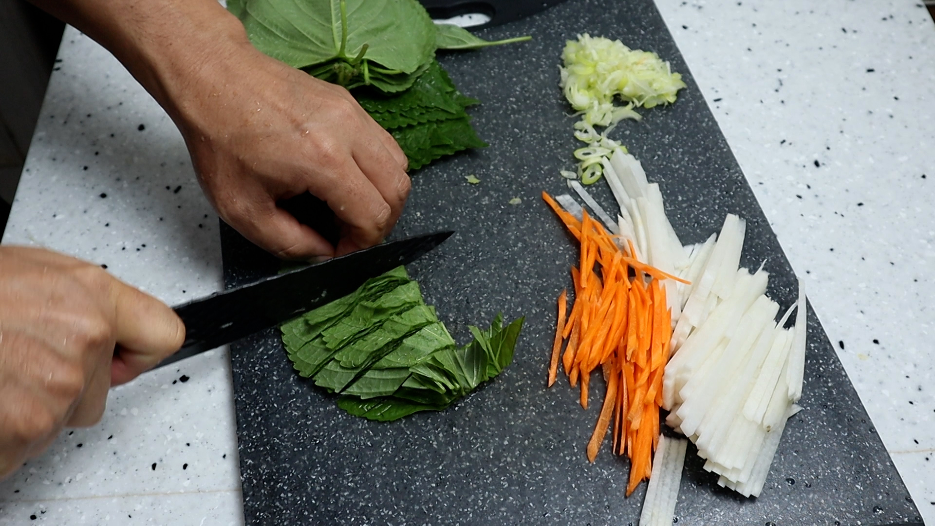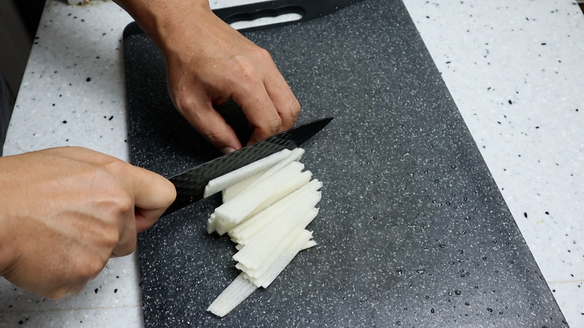 1. 무를 2mm 두께로 얇게 채를 썰어주세요.