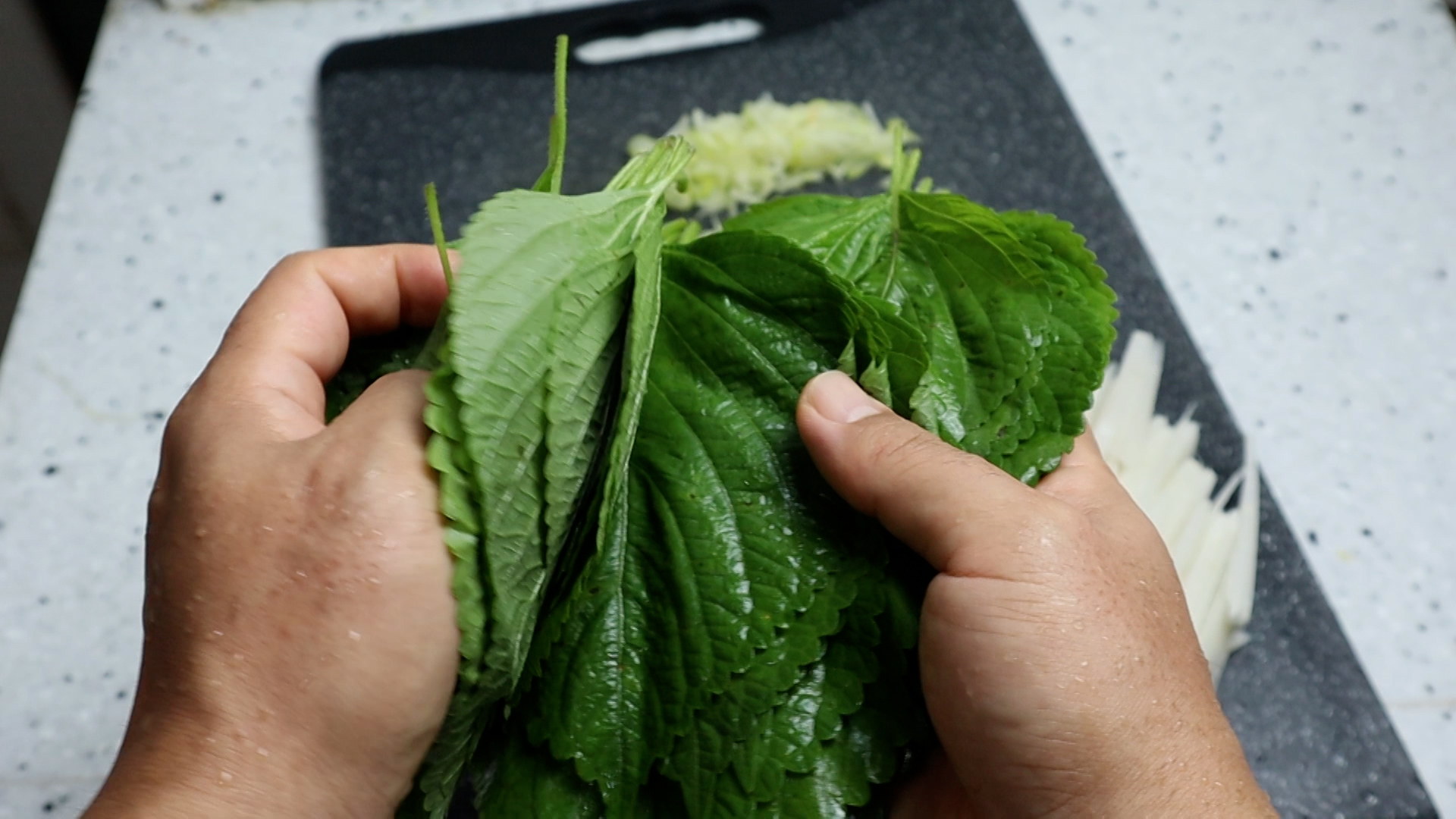 4. 깻잎을 찬물에 10~20분 담궈 불린 다음 흐르는 물에 1~2차례 씻어 3단을 준비해주세요.