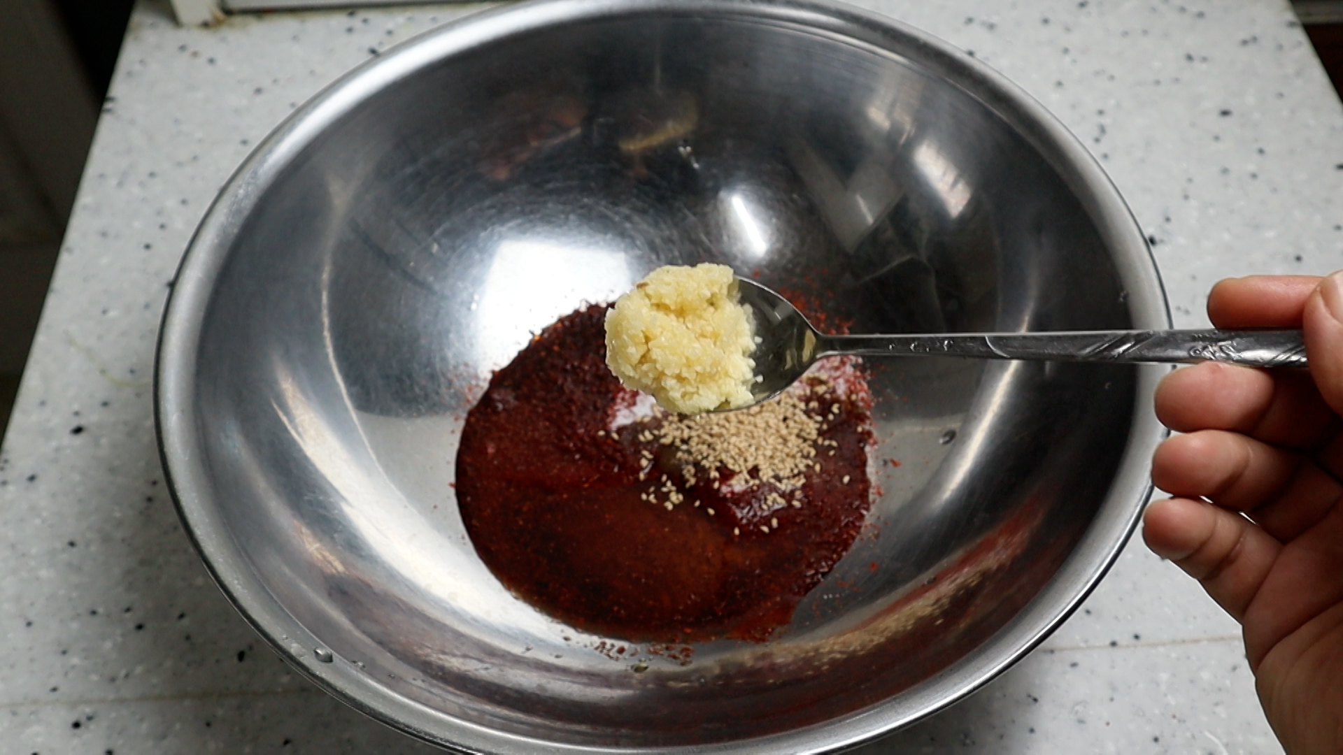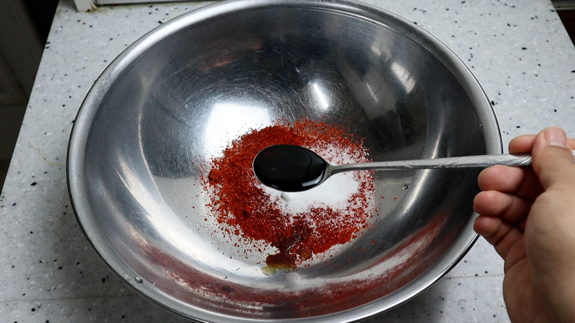 7. 양념란에 재료를 한데 넣어주세요. 고춧가루는 중간입자 고춧가루입니다.