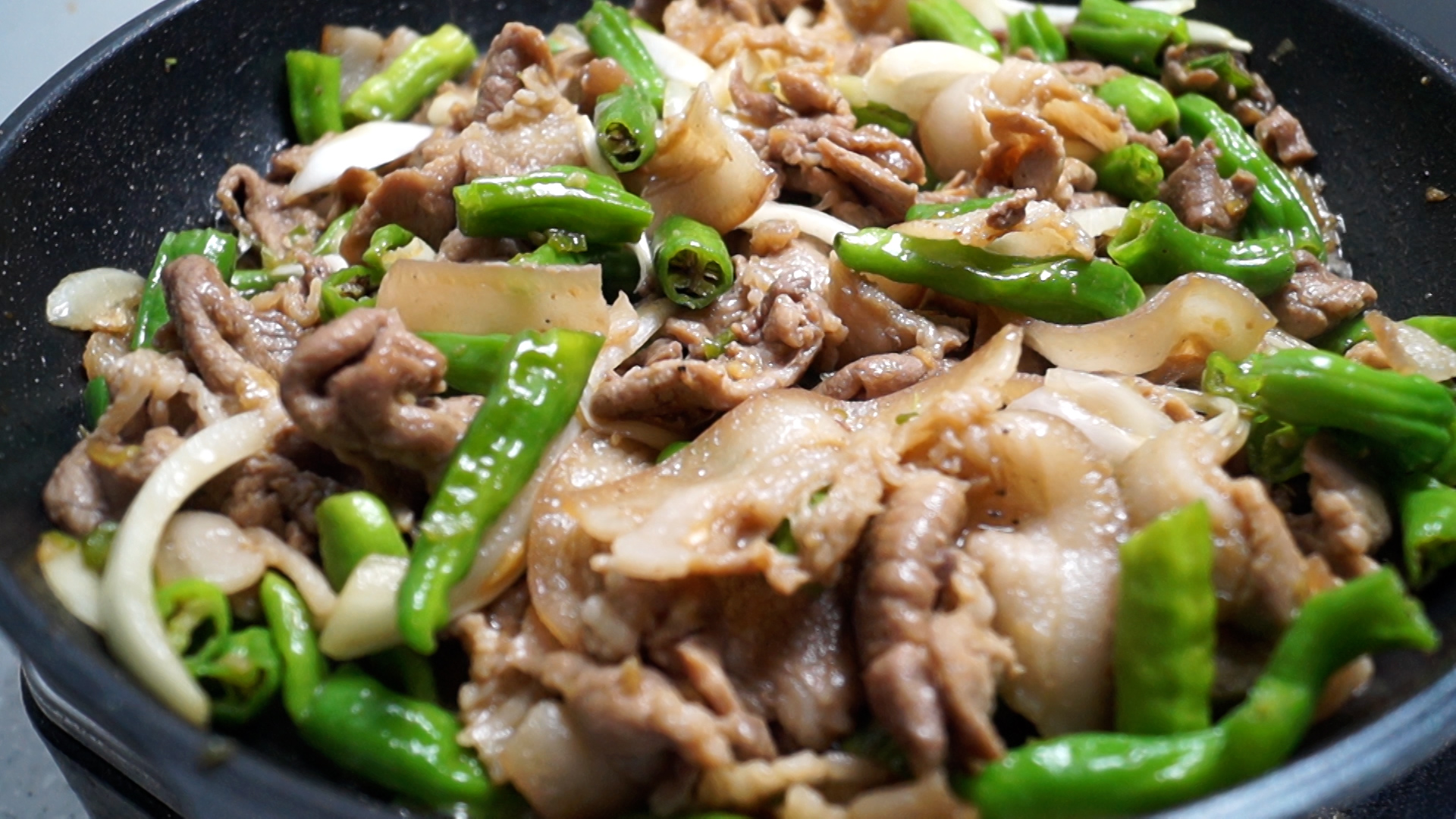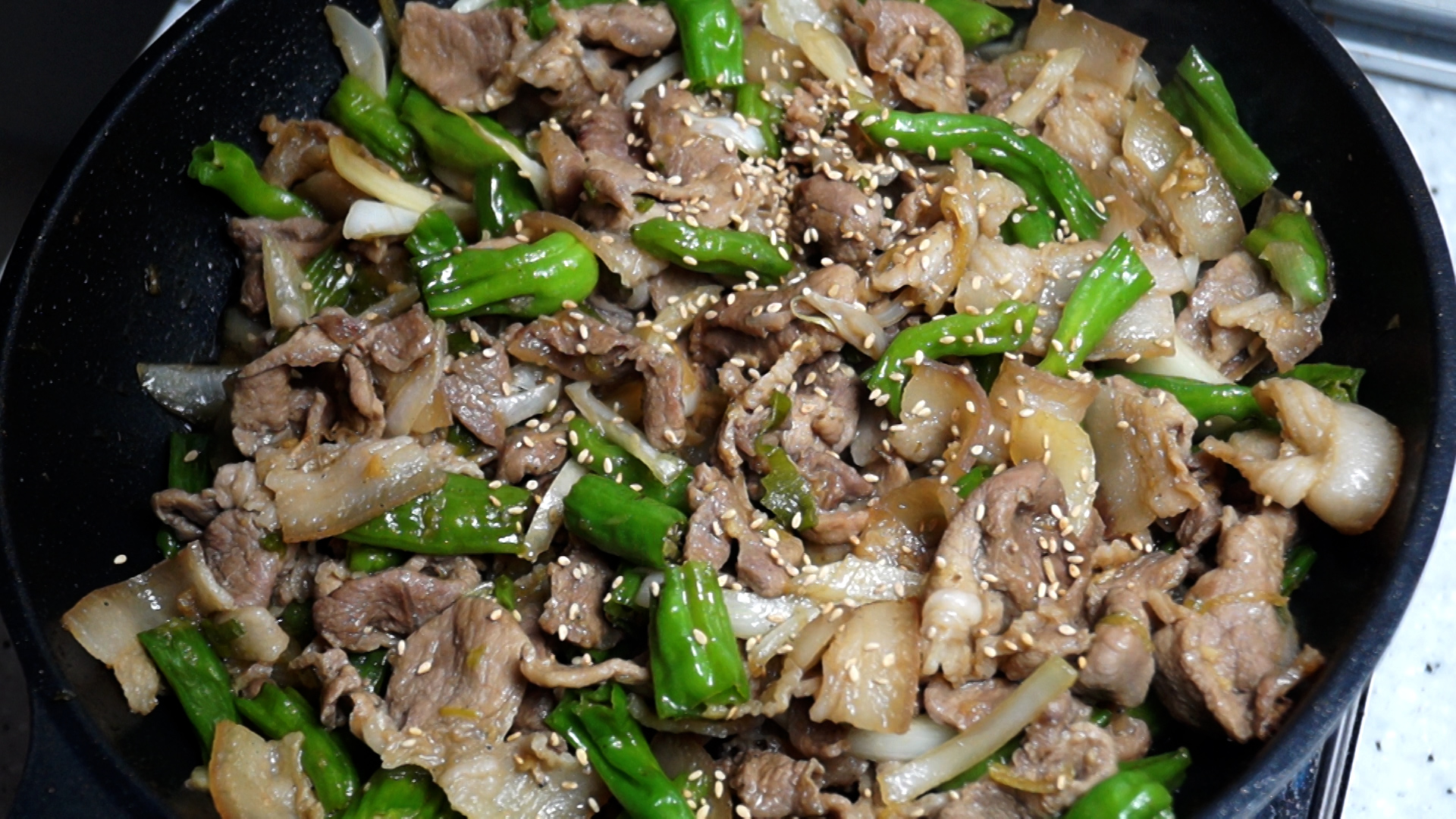 24. 양파와 꽈리고추를 넣고 2분 정도 더 볶아주세요.