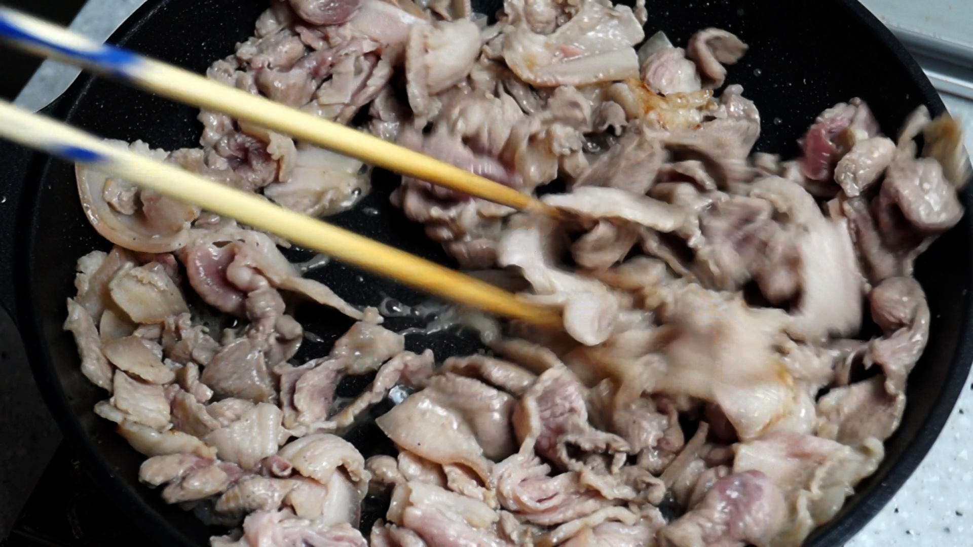 22. 강불로 달군팬에 밑간한 고기를 넣고 2~3분 볶아서 90% 이상 익혀주세요.