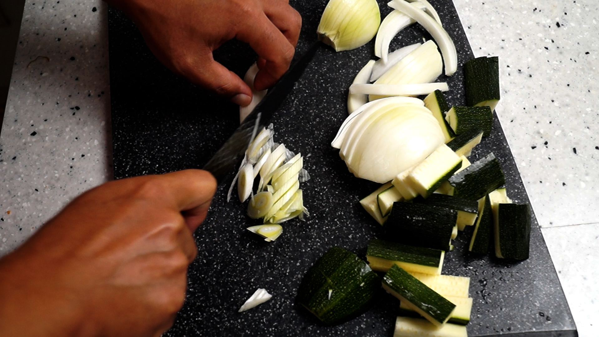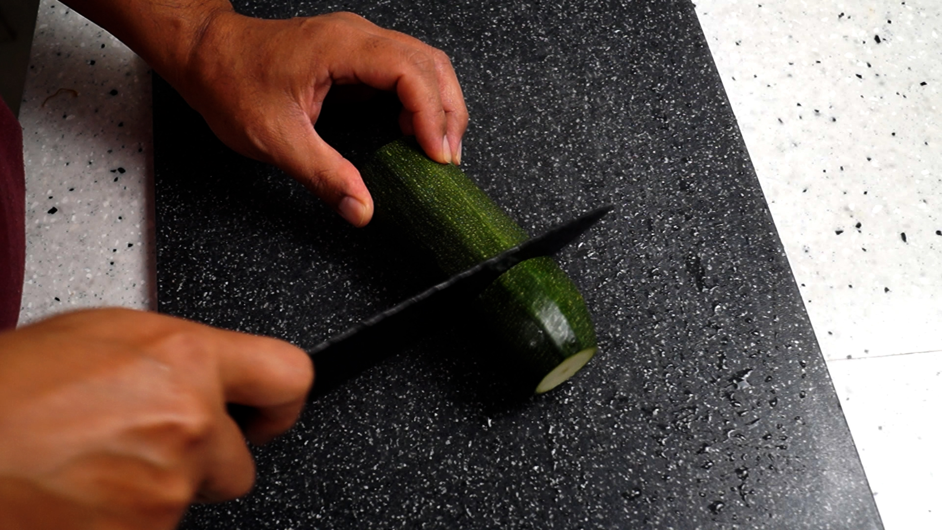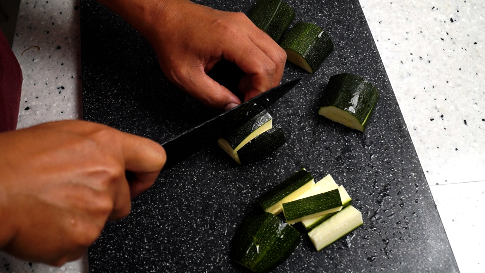 1. 애호박은 1개 긴호박은 반개정도 준비해서 3~4cm 길이로 썰어주세요.