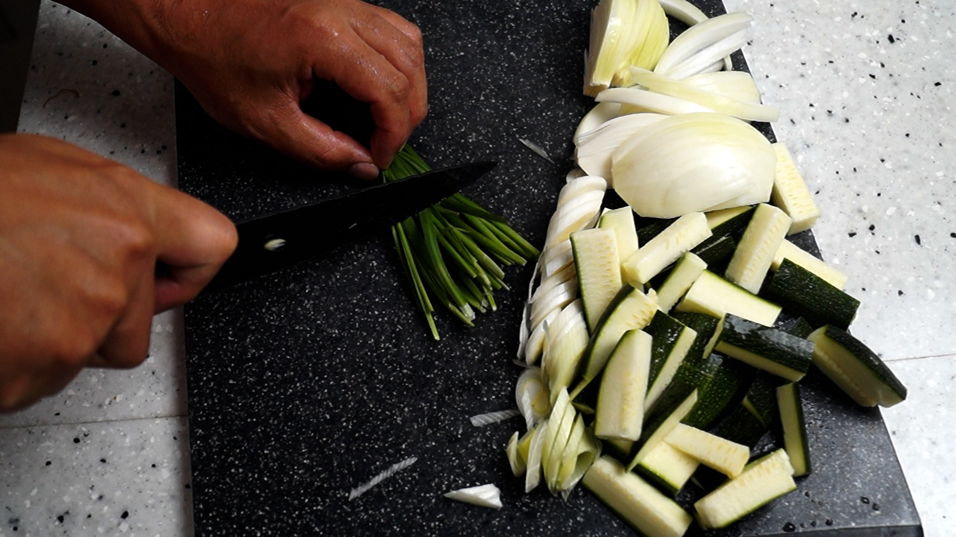 5. 활력 보강에 짱짱짱 이라는 부추는 가볍게 1줌 20~30g 을 4~5cm 길이로 썰어주세요. 부추는 없으시면 생략하셔도 됩니다.
