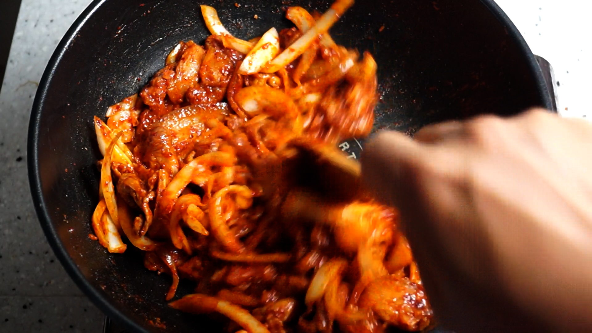 9. 양념을 전부 넣고 강불에 양념과 재료를 섞어 가면서 2~3분 정도를 볶아주세요.