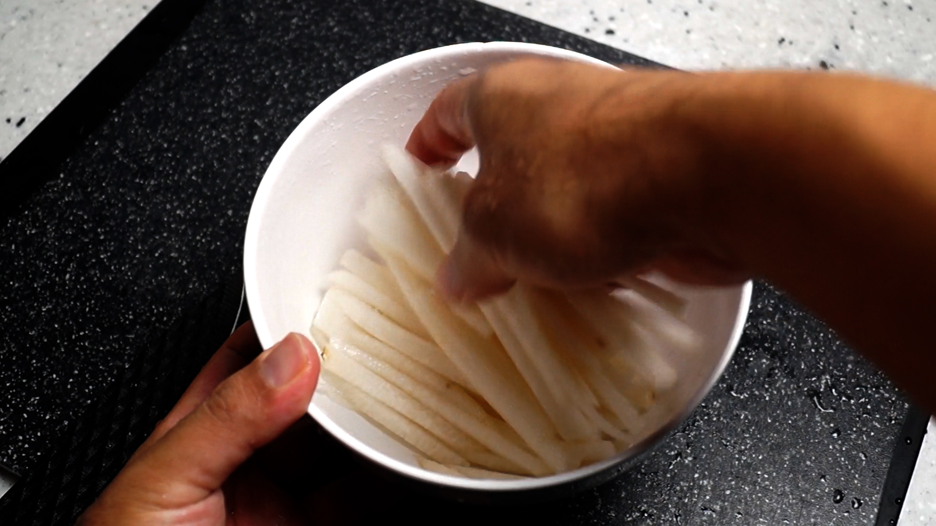 3. 무우는 골고루 섞어서 30분 정도 절여주시고 중간에 1번정도 위아래를 바꿔주세요.