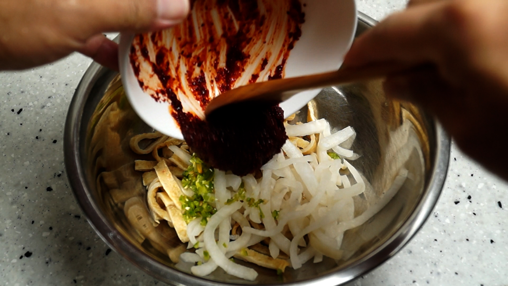 10. 어묵과 물기짠 무우 청양고추 양념장을 볼에 한데 전부 넣어주세요.