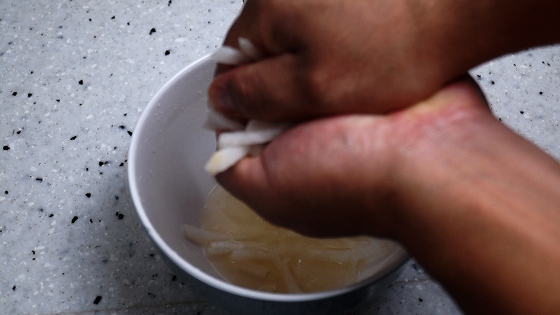 6. 절인 무우는 꽉!! 쥐어서 물기를 최대한 짜주세요. 면보가 있으시면 넣고 짜시면 더 좋습니다~
