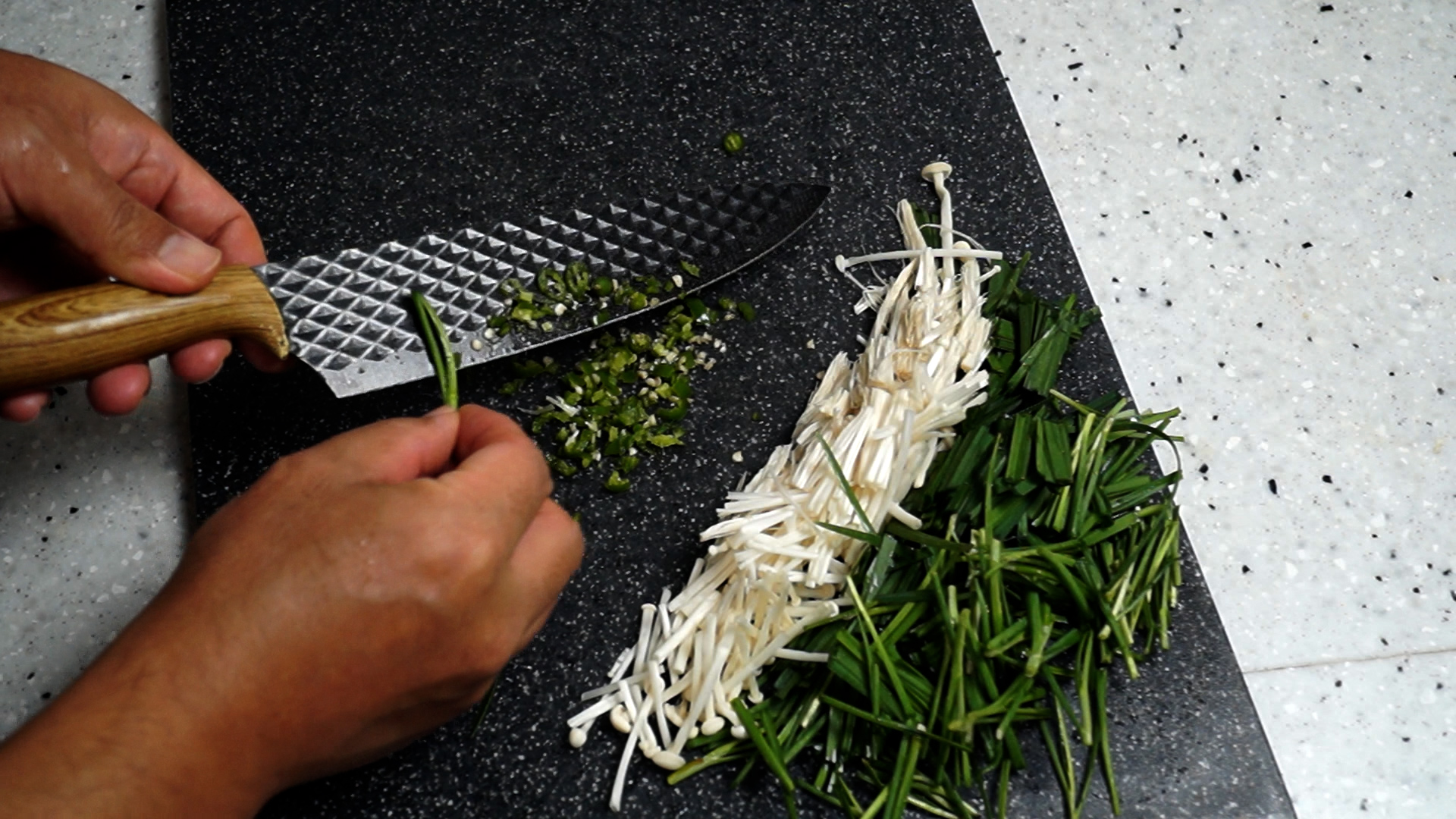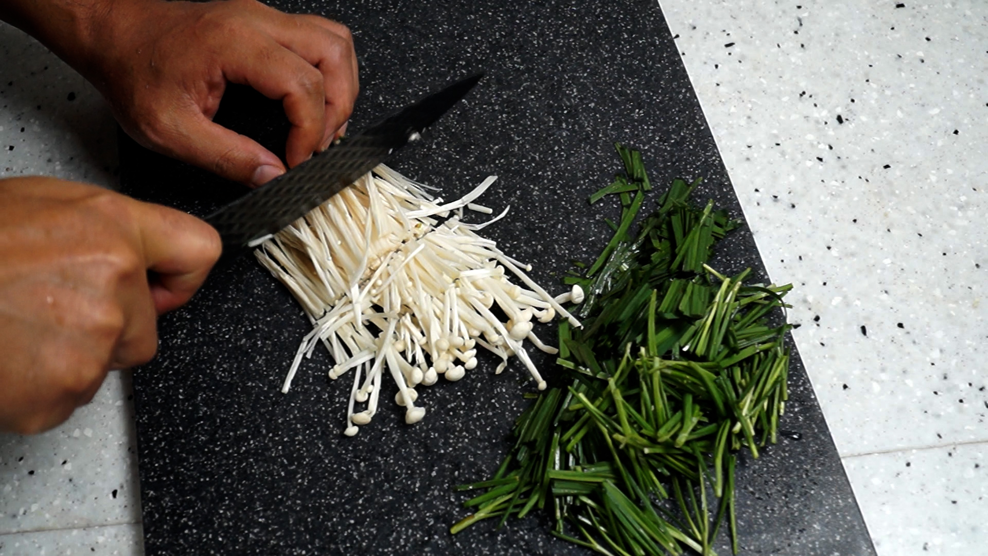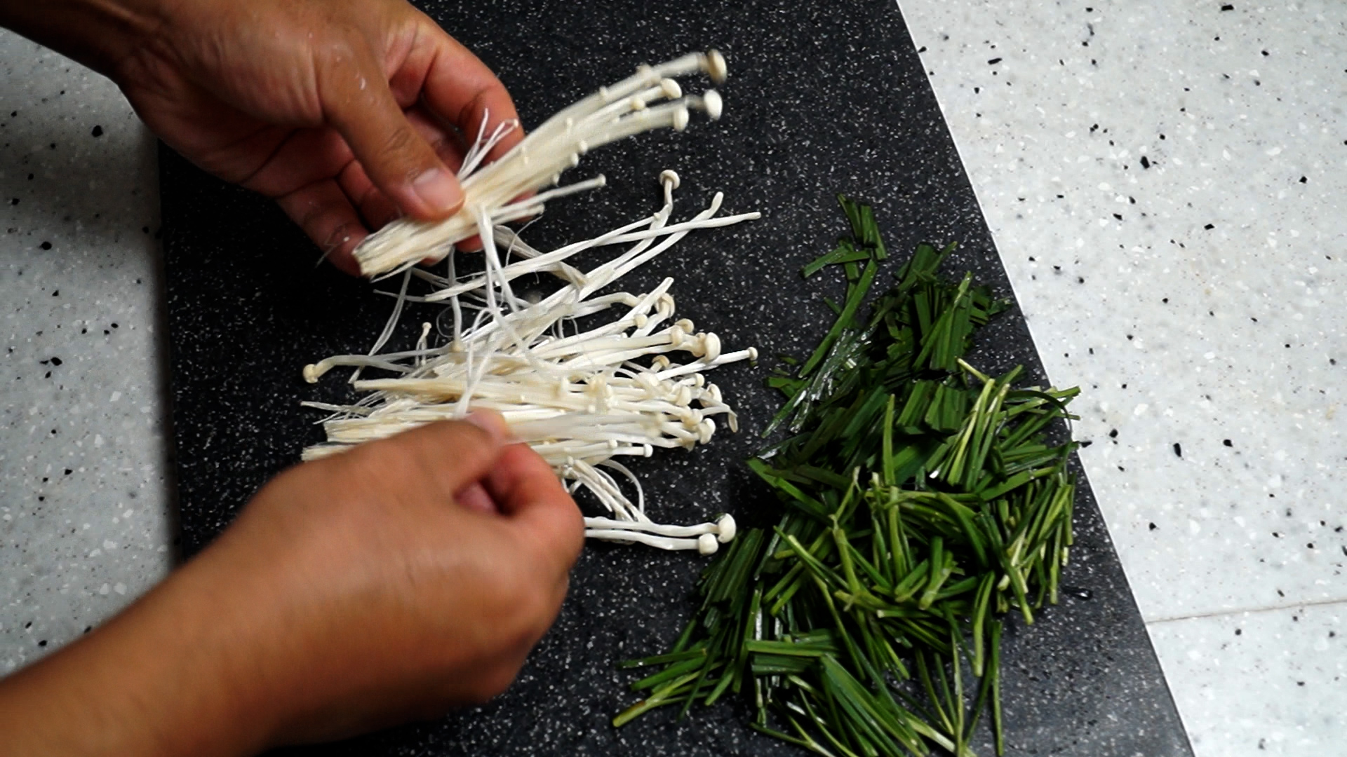 5. 찢어준 팽이버섯은 부추와 비슷한 길이로 썰어주세요.