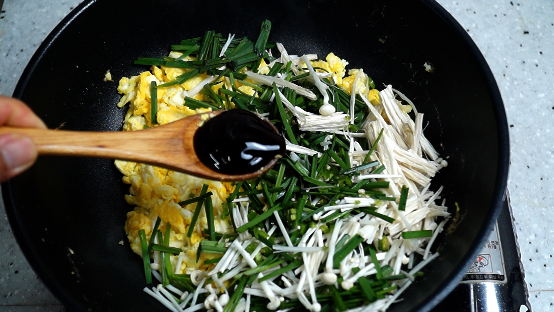 13. 강불에 1분 이내로 볶아주세요. 너무 오래 볶으면 부추랑 버섯이 질척거리며 떡이 될수도 있습니다.