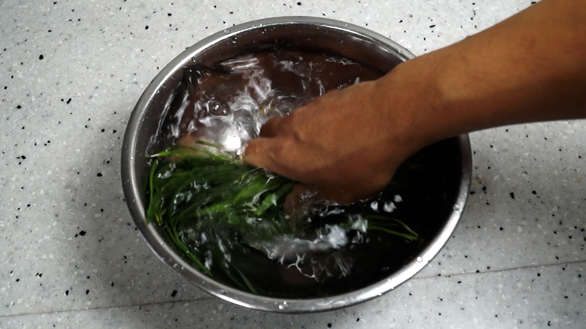2. 부추에 찬물을 넉넉하게 부어 10분정도 때를 불린 다음 1~2차례 가볍게 흔들어 씻어주세요. 이건 생으로 먹는게 아니라 볶을거라 좀 세게 씻어도 큰문제는 없어요^^