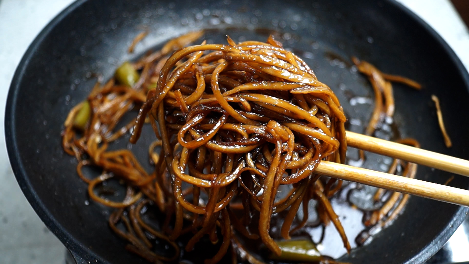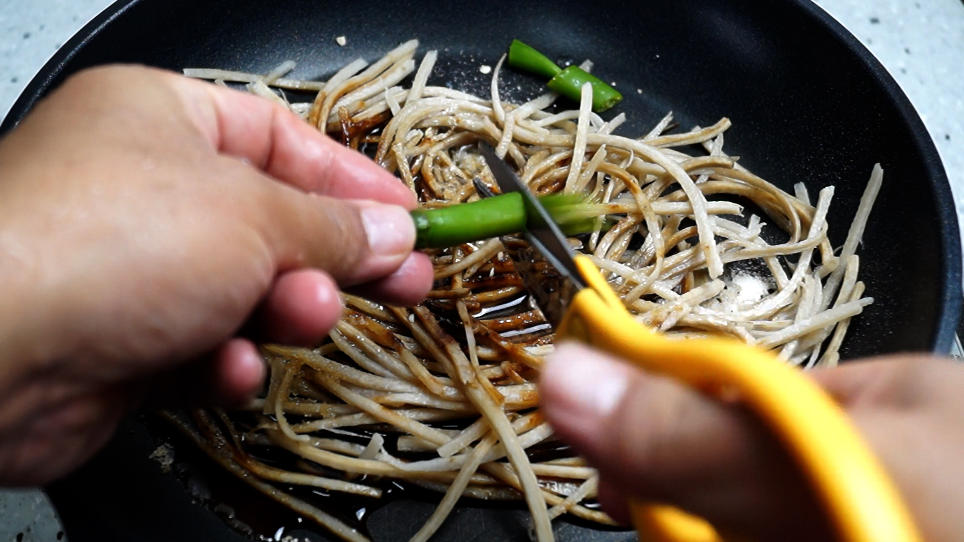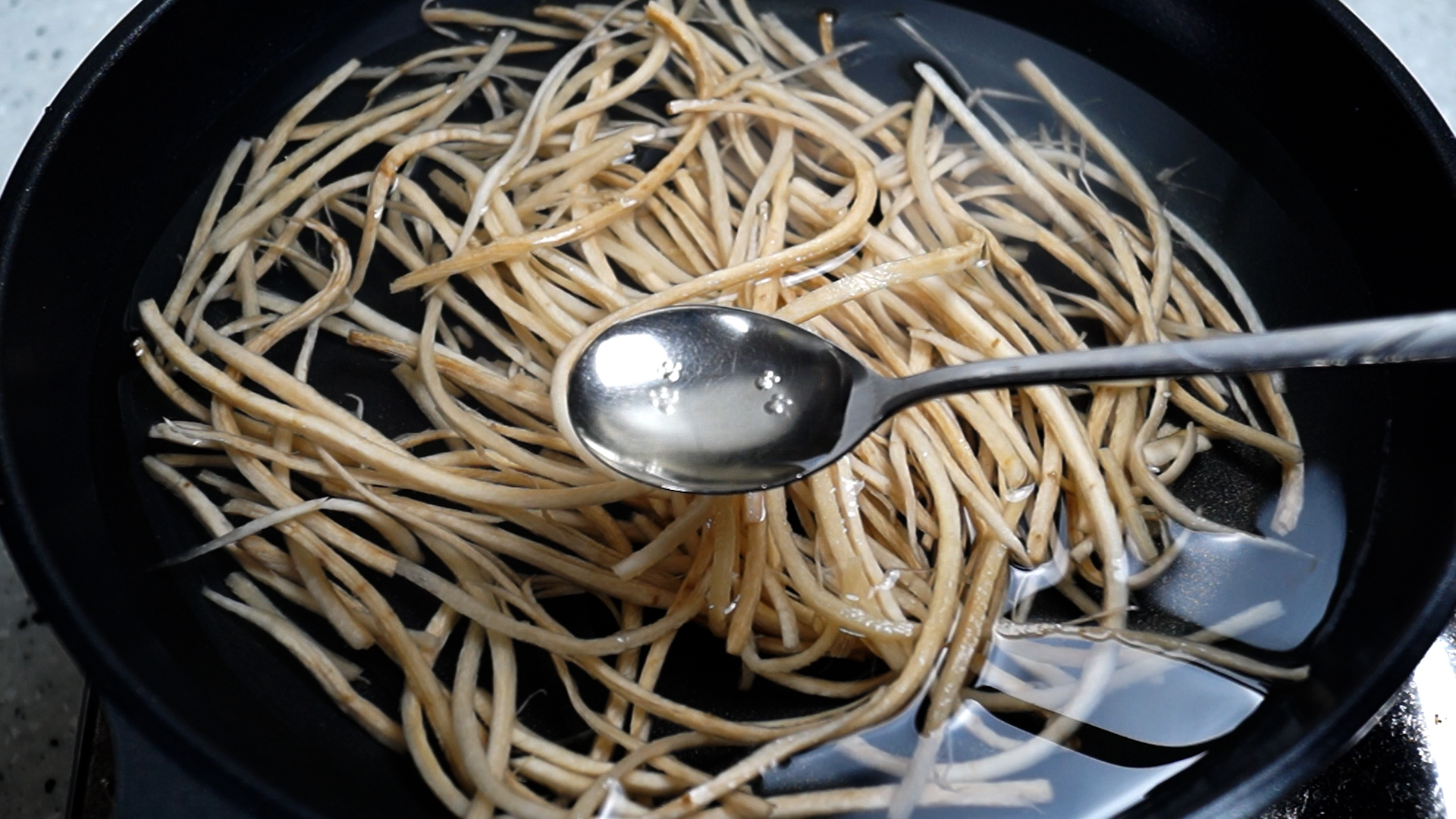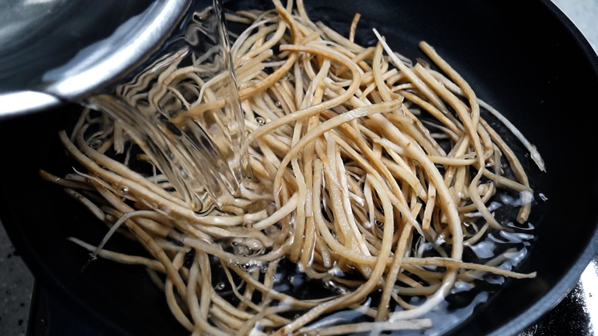 2. 우엉을 팬에 넣고 물 1리터를 부어주세요. 우엉은 통으로 사서 썰어 사용하셔도 되지만 이렇게 채 썰어 있는걸 사시면 무지 편해요~