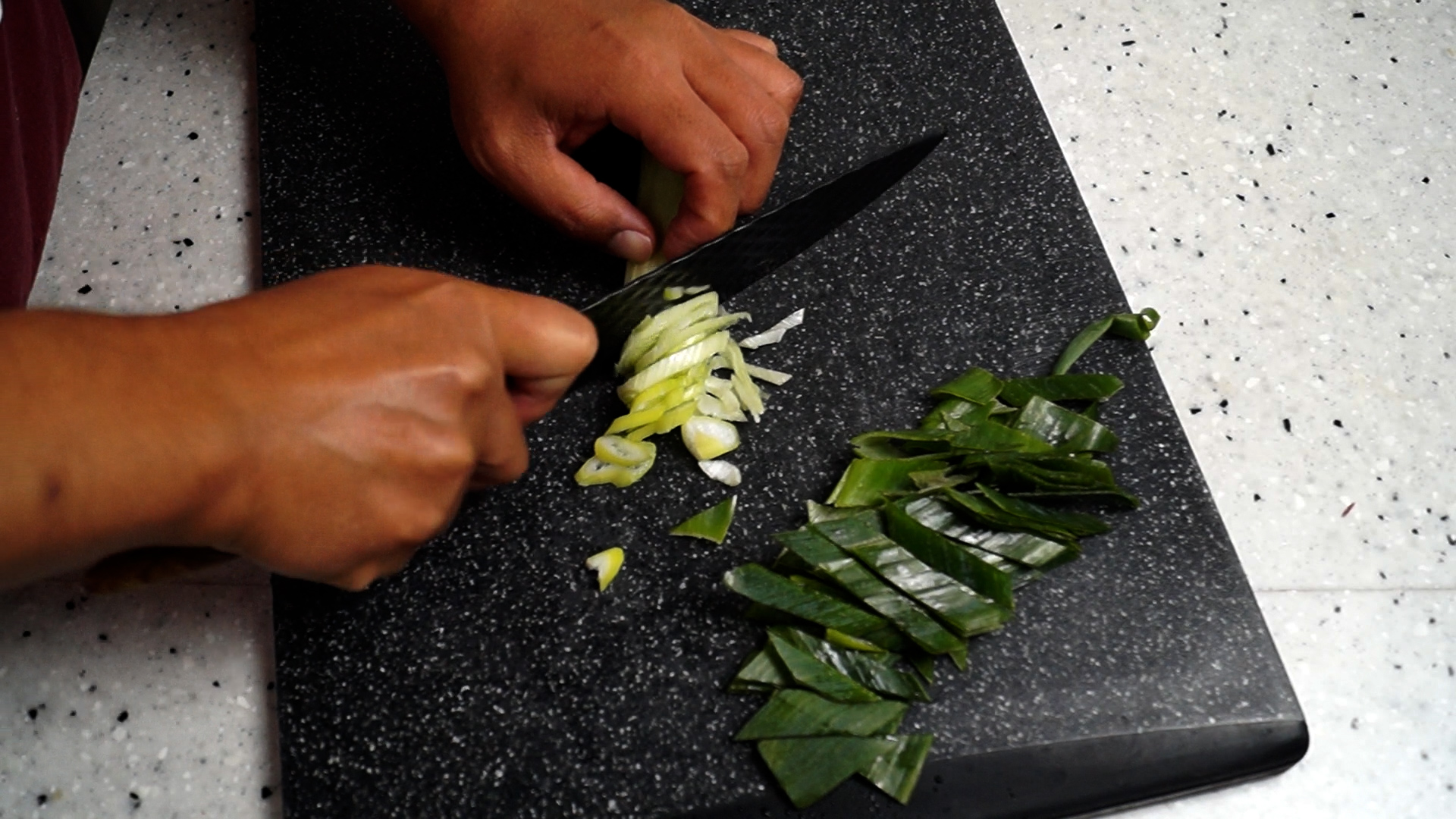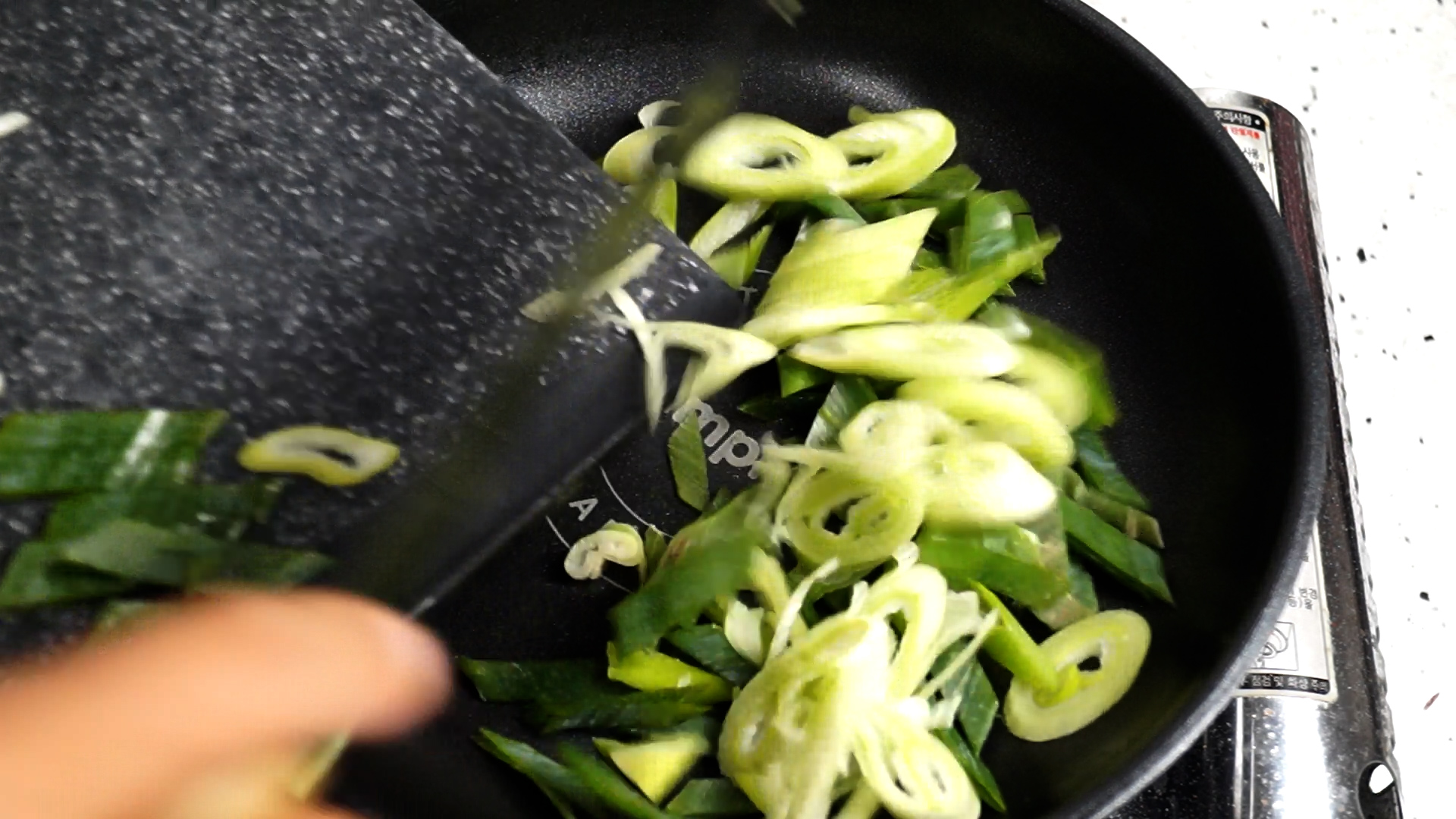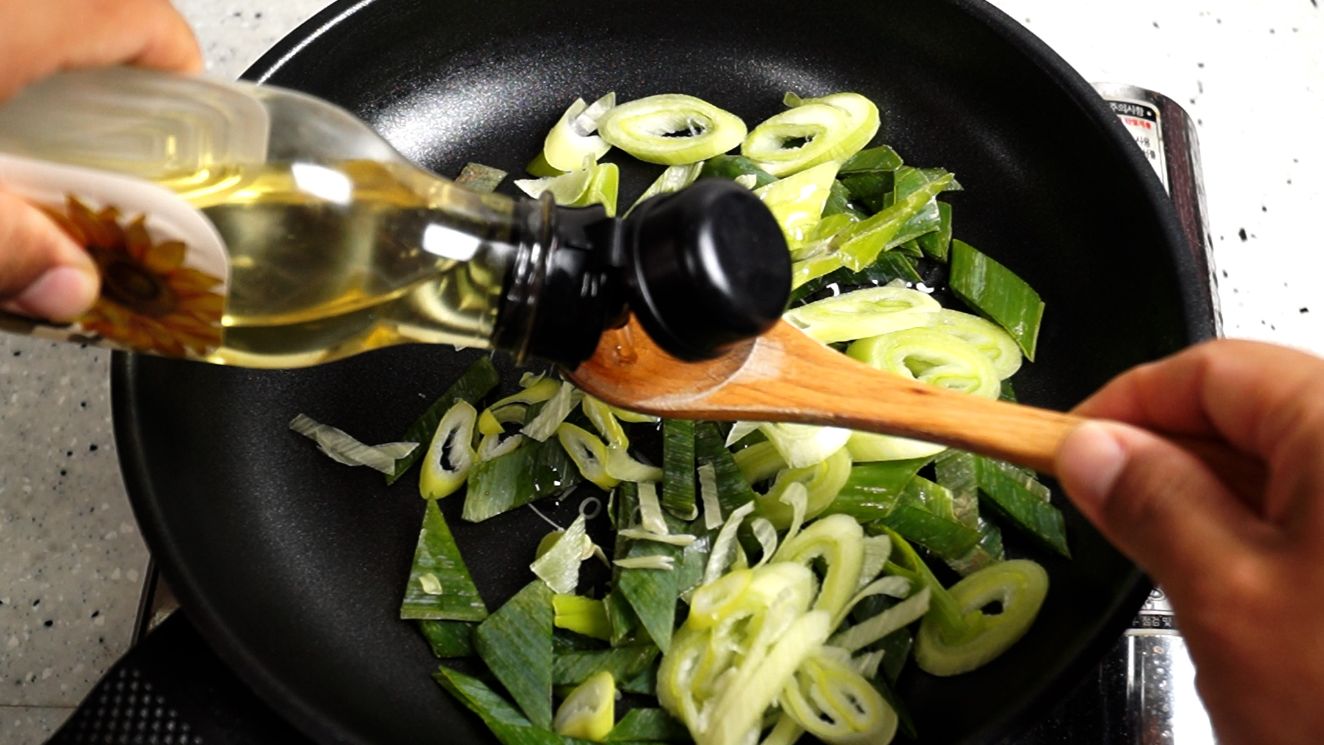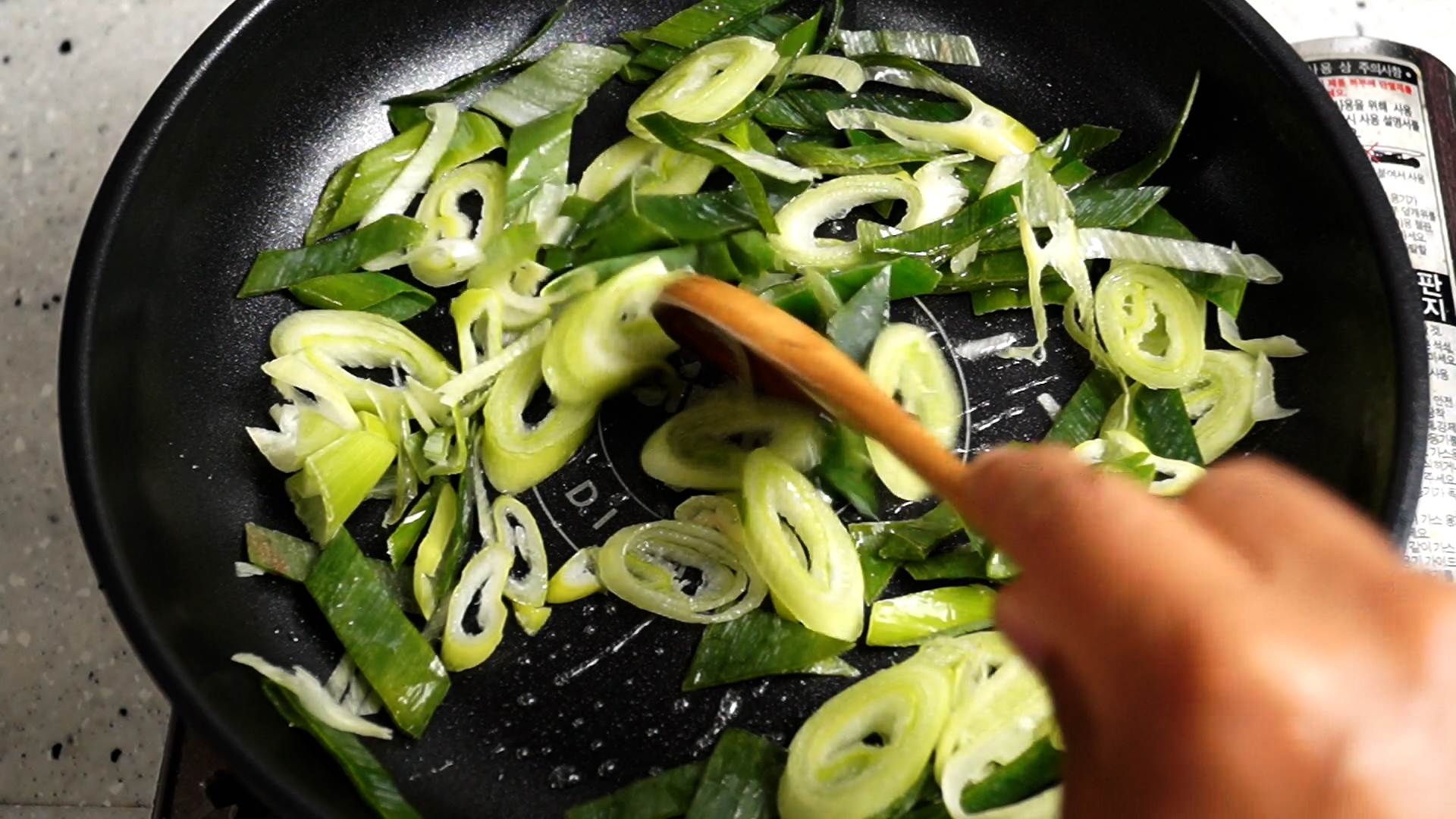 4. 예열하지 않은 팬에 대파를 먼저 던져넣어주세요.