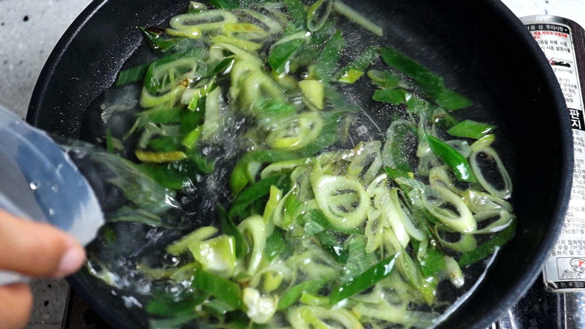 7. 파 익는 향이 맛있게 올라왔을때 물 3컵 600cc 를 부어주세요.
